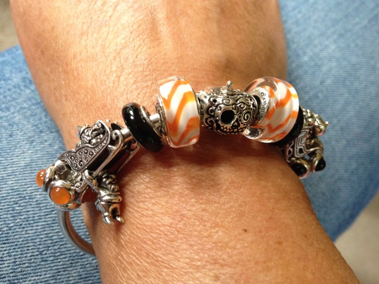 Combined with Deadhead Ohm beads Bead of the Month october 2015, a sugar skull the theme was set! I added two Pandora cabochons and two Tedora mini muranos and the bangle is Haloween as I would like, not to scary, lots of candy: Ultimate Sugar Ride!