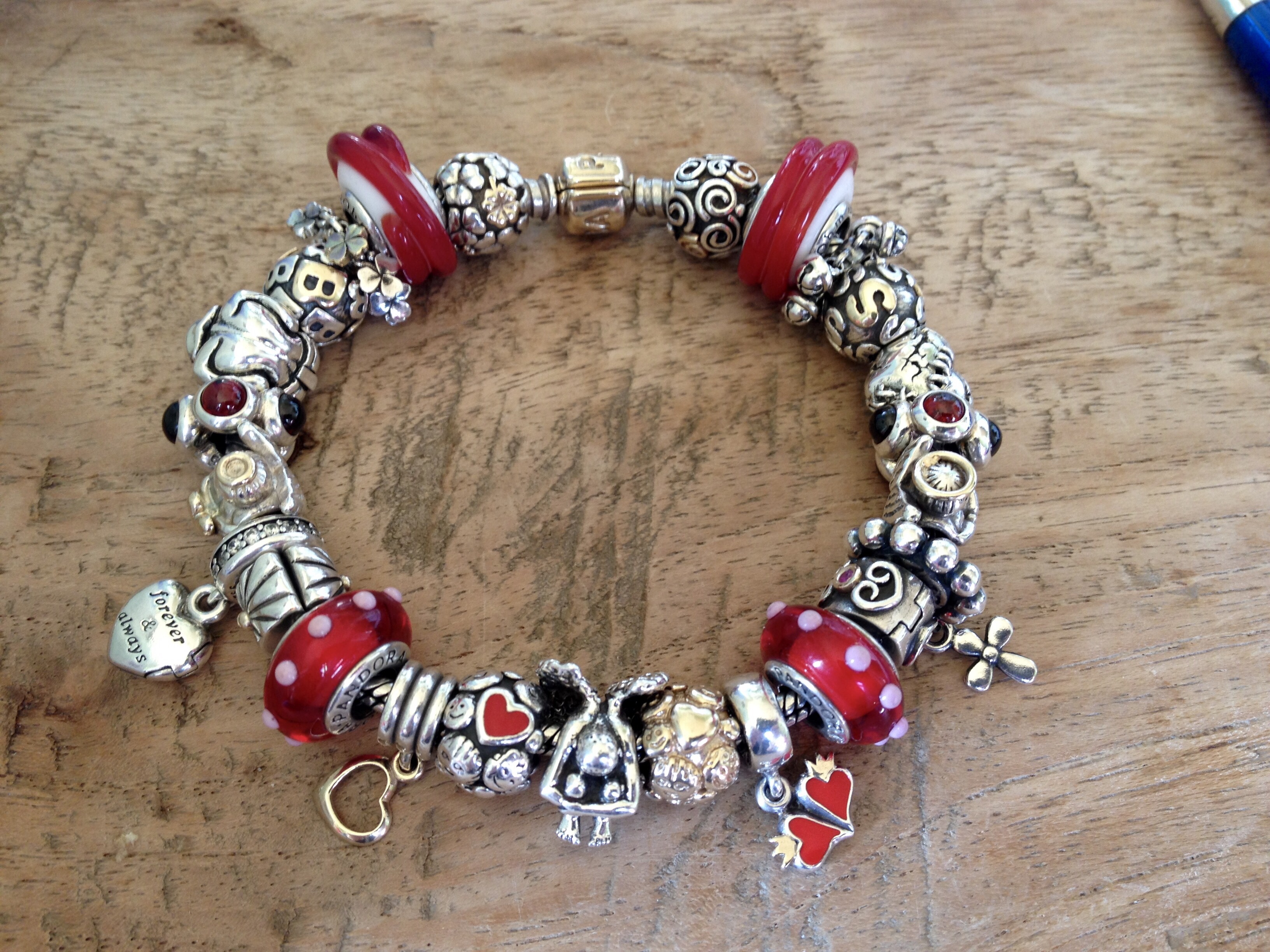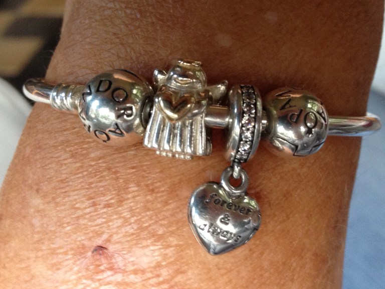 Coming around to the other two tone Pandora angel and Pandora heart dangle. These two are so very special. The Pandora heart contains some of my brother’s ashes, he died a year ago. I received the angel as a gift from an amazing group of ladies from the Pandora’s Angels Facebook page when they learned about this. I am still so grateful for such a token of love!
