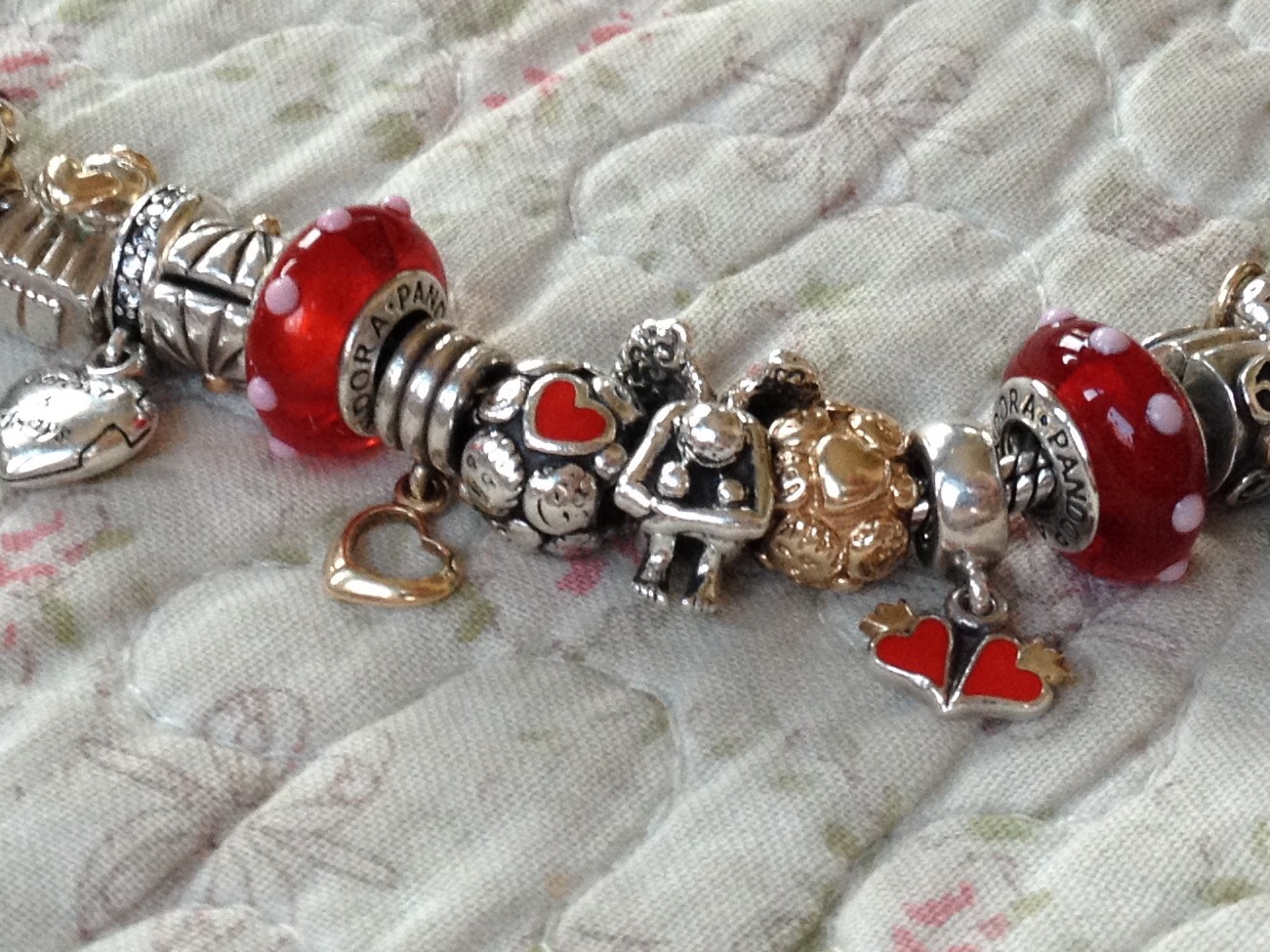 With two Pandora Family Ties and Pandora heart dangles (Christ charm and Royal wedding) the theme is complete. The glass beads are Pandora red Seeing Spots and Ohm beads Cherry Sauce.