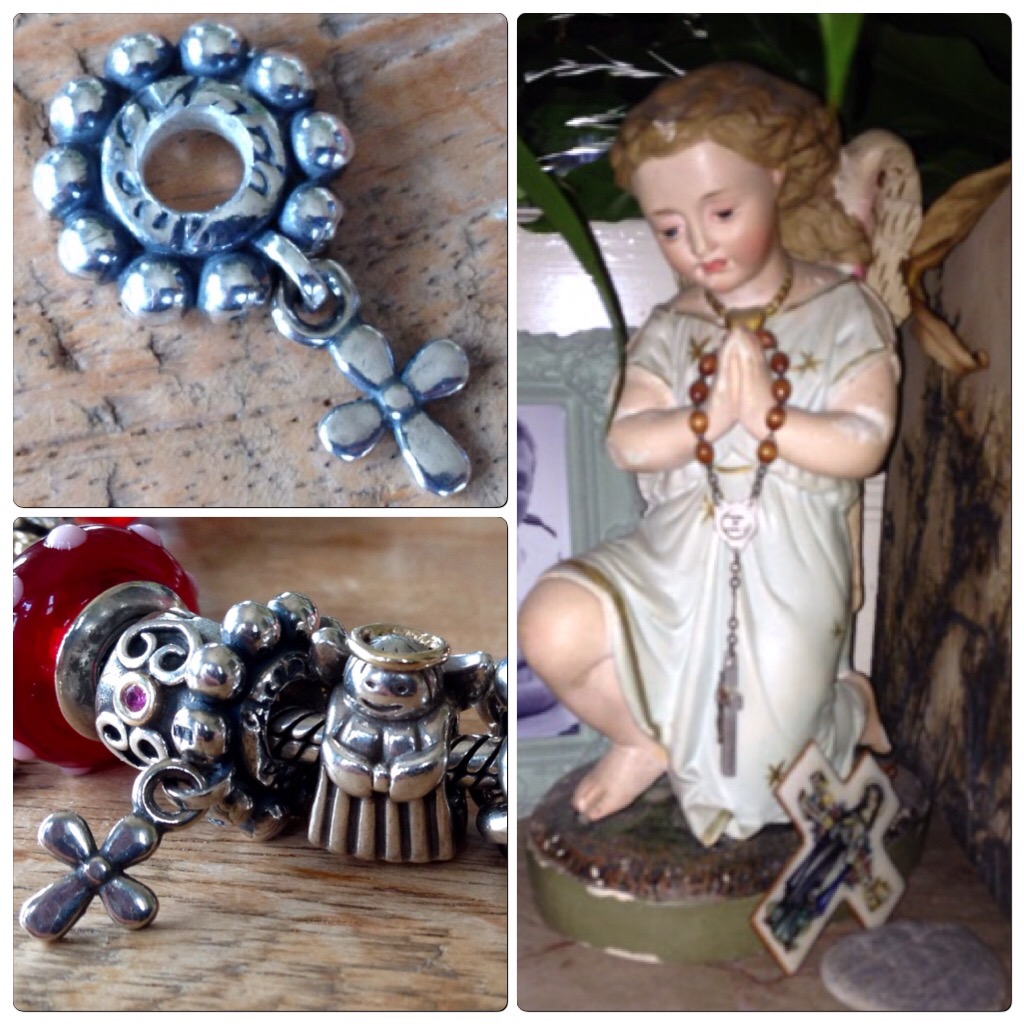 The two tone customized Pandora angel with the Trollbeads Rosary reflects the angel on my mantle, she is my guardian. The Rosary was made a bit bigger to fit the Pandora bracelet! It says Ave Maria in the center.