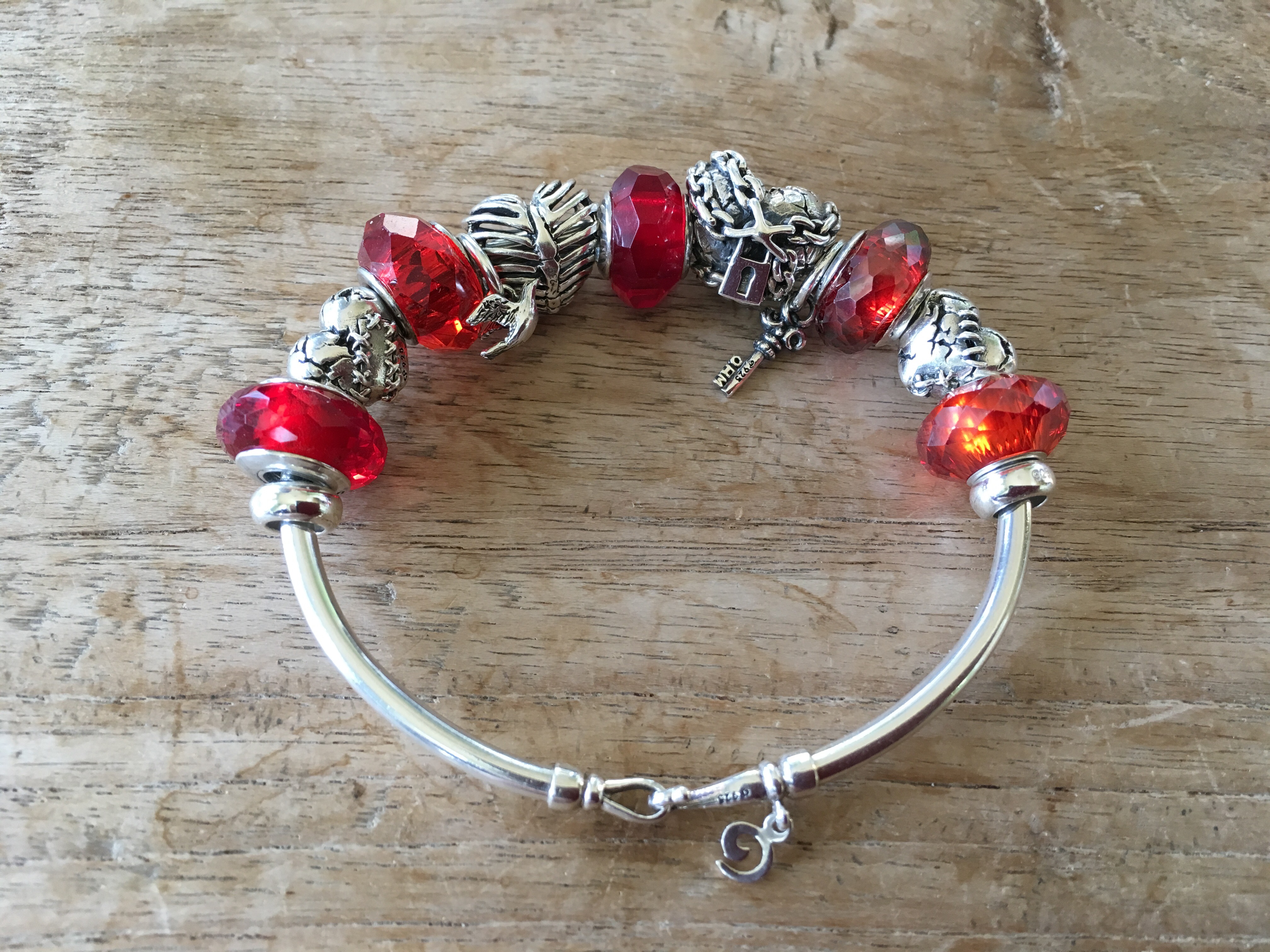 From the January release I got the Bead of the Month Year of the Cock and two Fireballs. With two Ohm facet glass beads I made this bangle to wear to the party.