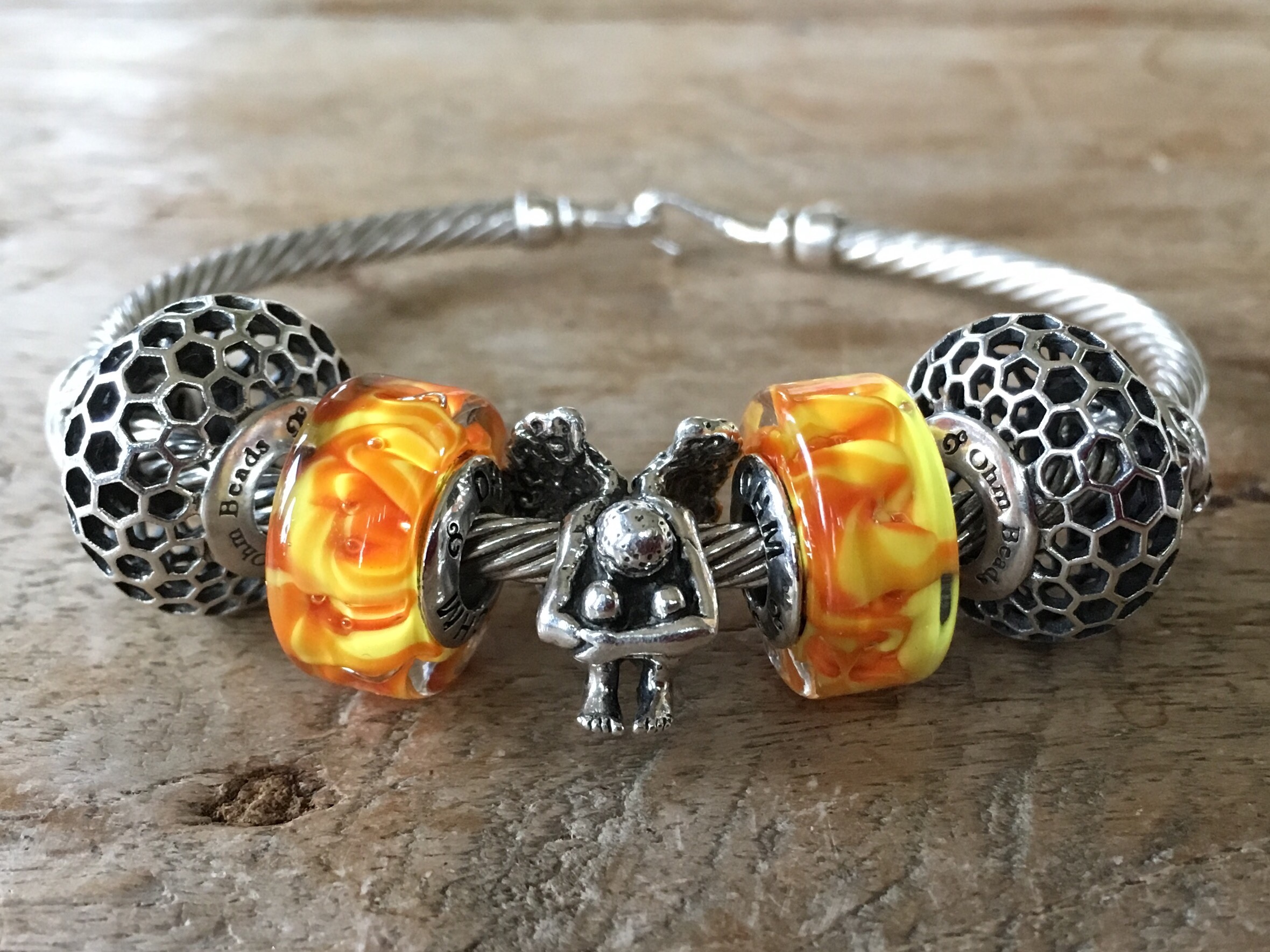 There are two Ohm beads red facet glass beads on this bangle and two fire-ish stoppers!