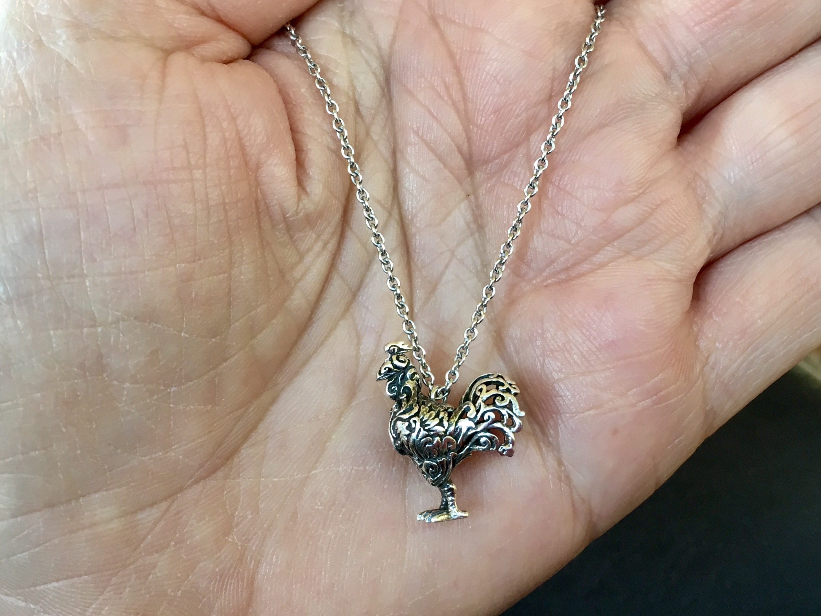 The Rooster can also be worn on the ball necklace. This is the retired ball necklace.