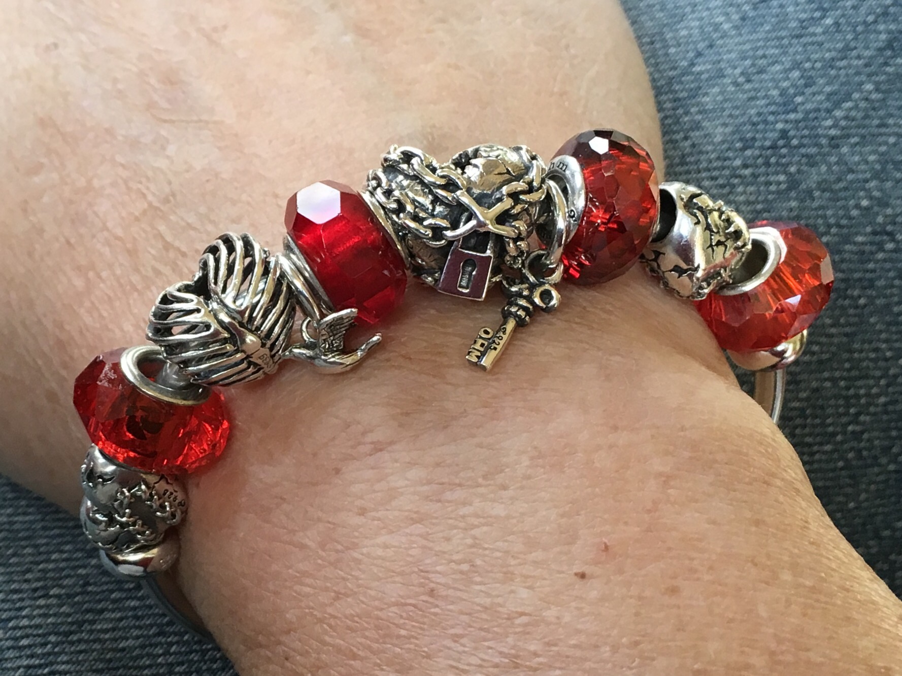 A very special bead with a red enamel heart on the back is the Pandora doghouse. I got it to remember my dog Robin. I had the letter R engraved on the bottom.