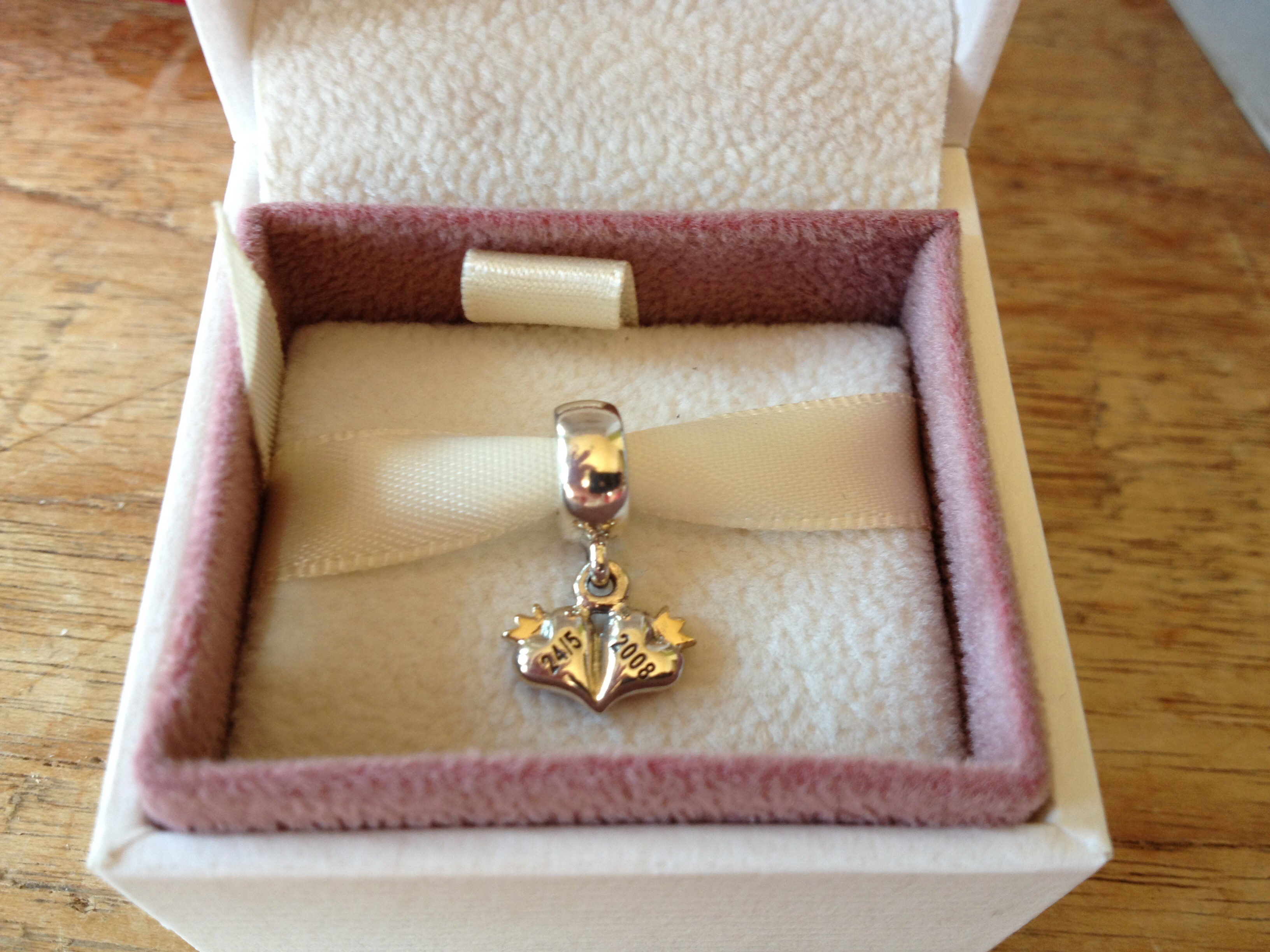 And the Pandora Royal Wedding charm, for the wedding of the second son of the Danish queen. It has the wedding date engraved on the back. This bead has red enamel hearts on the front.