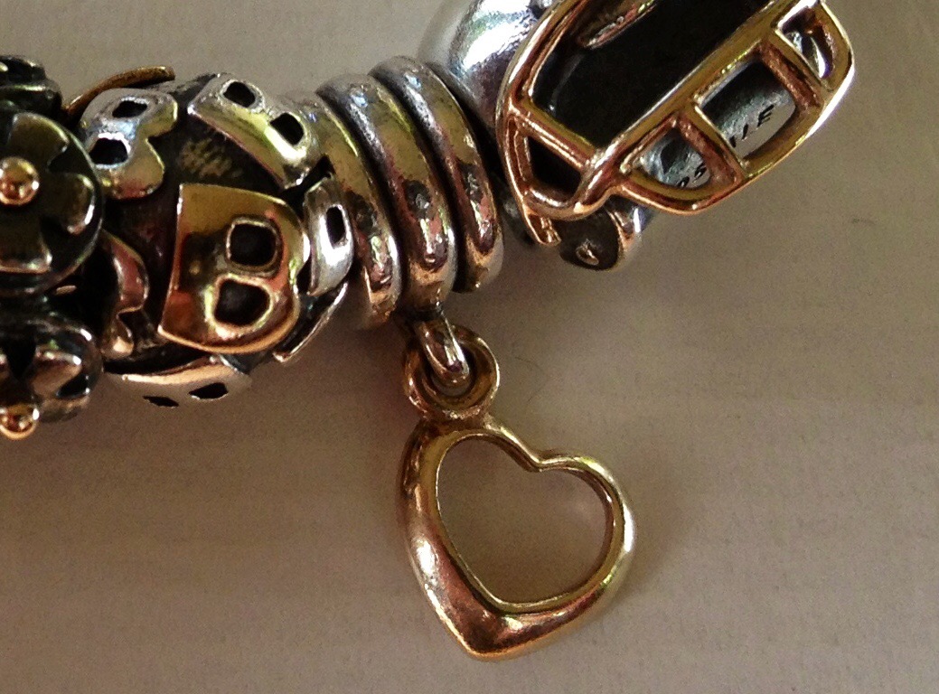 One of my very first hearts was the Pandora plain heart. This is on my Family bracelet. It is for my husband, next to the baby carriage for my son (also with heart!). Now I look at this bracelet, it has many beads with hearts! I love the two red enamel beads with the hearts.