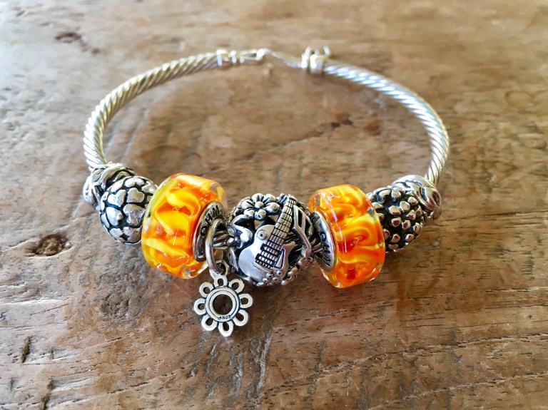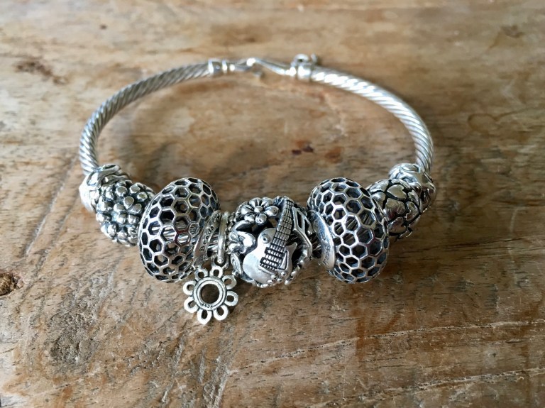 I love wearing this, the Trollbeads Anemone dangle sits on the edge of my wrist, it feels like I am wearing a corsage! And Woodstock taking centre stage!