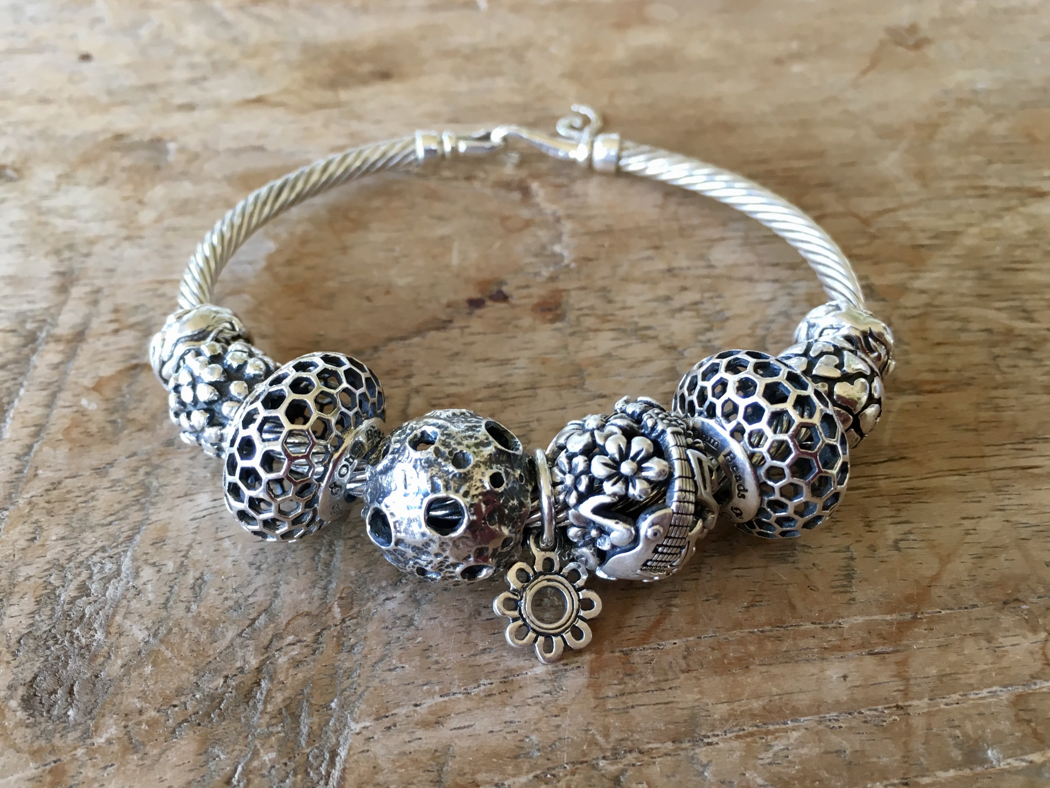 It was just last week that I finished my Trollbeads bangle by adding Giant Lotus to the Flower Diamond glass with Lotus Top. Also on this bangle is the Anemone Pendant with Anemone glass and a Pandora amythist and onyx cabochon. I decided to incorporate these beads into the Hippy bracelet. All the flowers are beautiful and make a big statement!