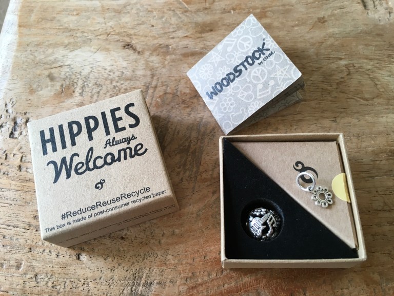 It comes in a box, together with one of the dangles from the Woodstock collection in a blind box, so you don’t know witch one you get. The box is scented, I believe it is Musk, a very sixties smell!