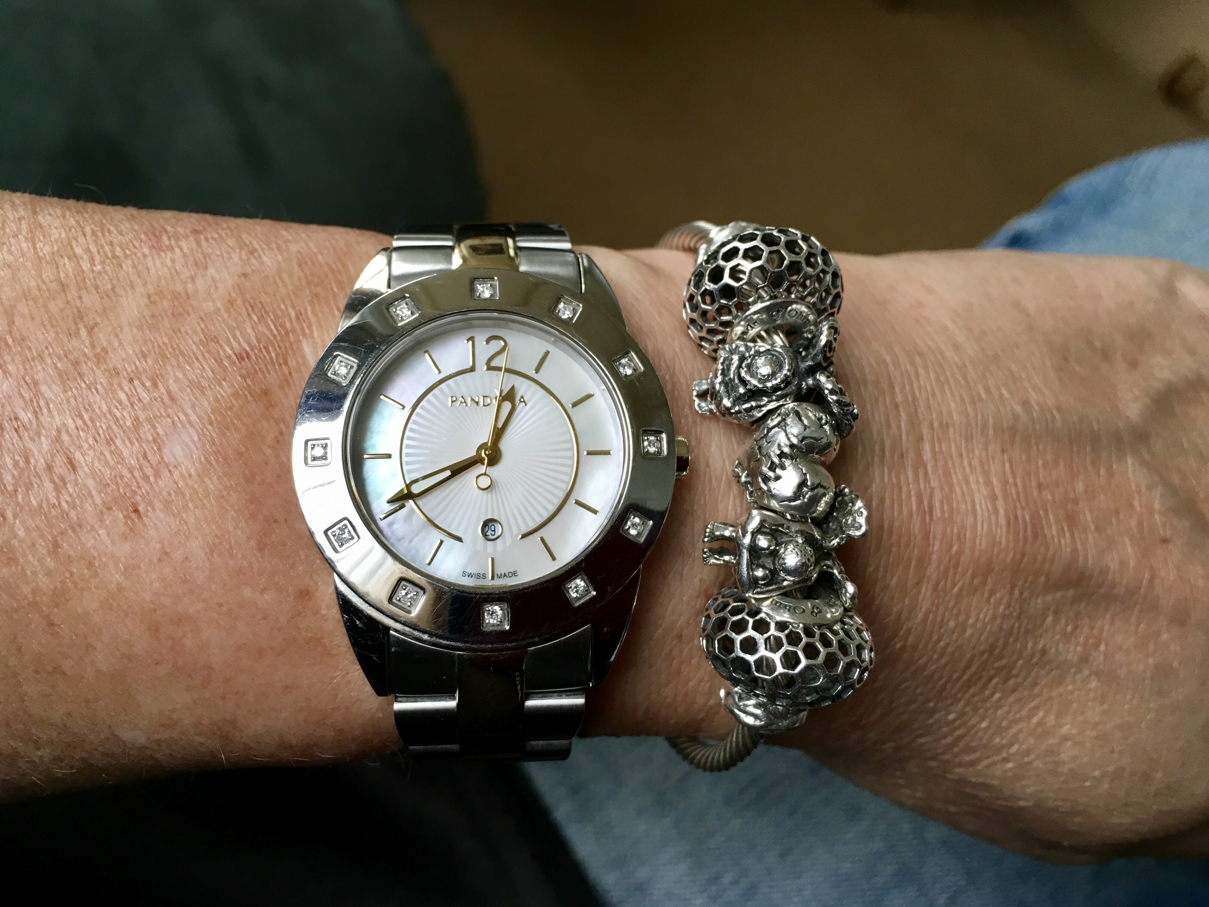 Bangles with the black and Mother of Pearl Pandora Imagine watch. I bought the white Pandora double leather.