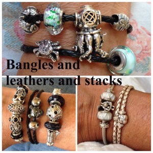 I cannot live without my bangles and leathers now! Some bangles are permanent, like the Space bangle and sometimes a bangle is absorbed by a bracelet like the Trollbeads bangle into the Ohm Woodstock Hippy bracelet. They give me an endless design opportunity and something new almost every day!