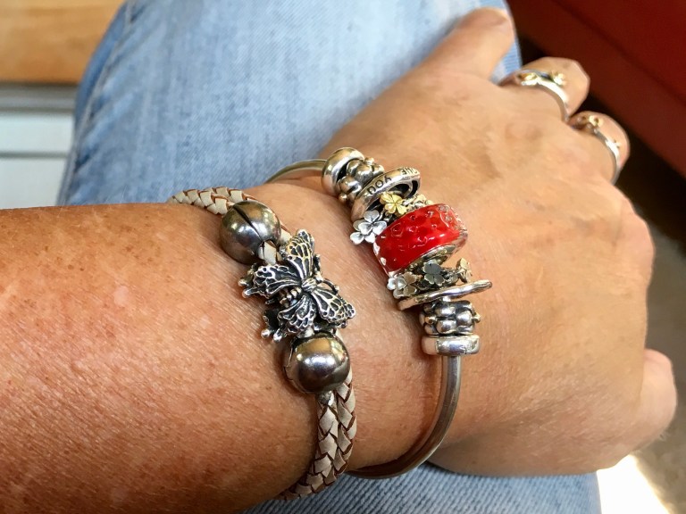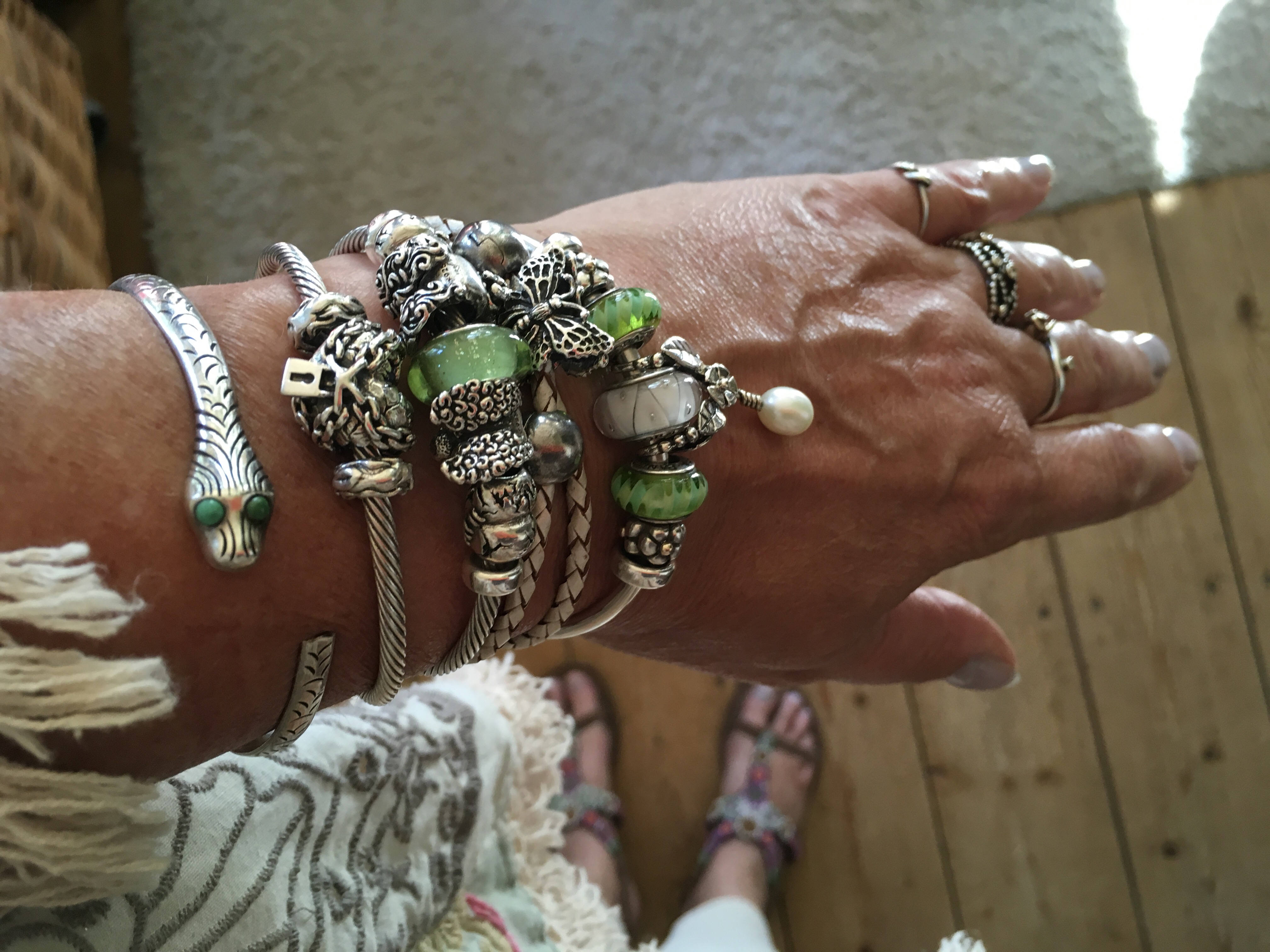 Here with a Trollbeads bangle, stoppers, Only one you, Pandora gold tipped flowers, Ohm beads Strawberry glass, Lucky Moves, Moving On and Pizza.