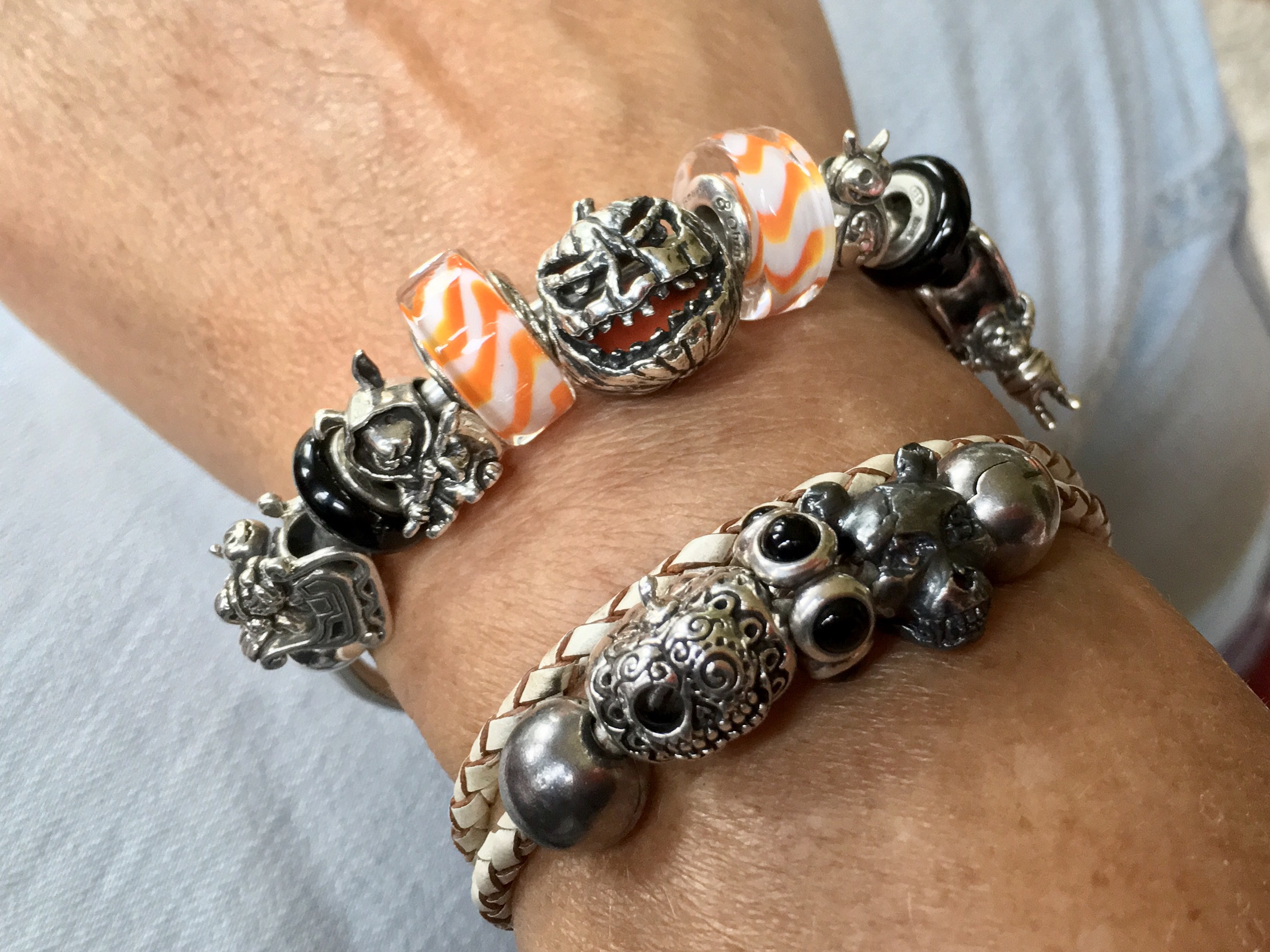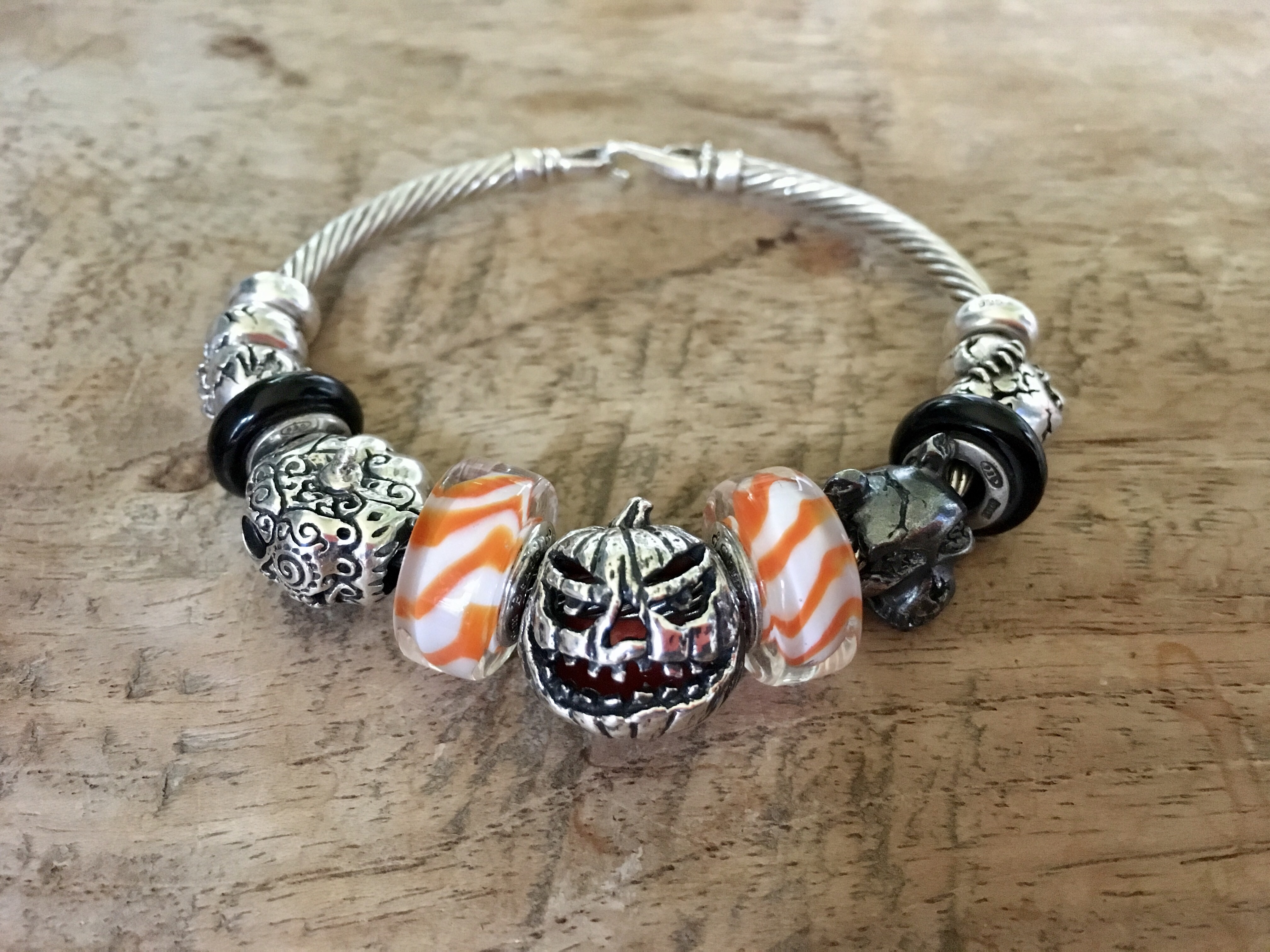 Put all the beads together on this awesome Haloween bracelet with Love Cage (BOTM February 2016) and Hug Me (BOTM June 2016). The orange glass is Trollbeads and Pandora, the black glass Ohm beads and Pandora and the orange and black cabochons are Pandora. The bracelet is Trollbeads.