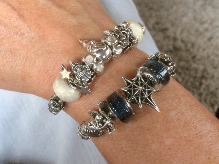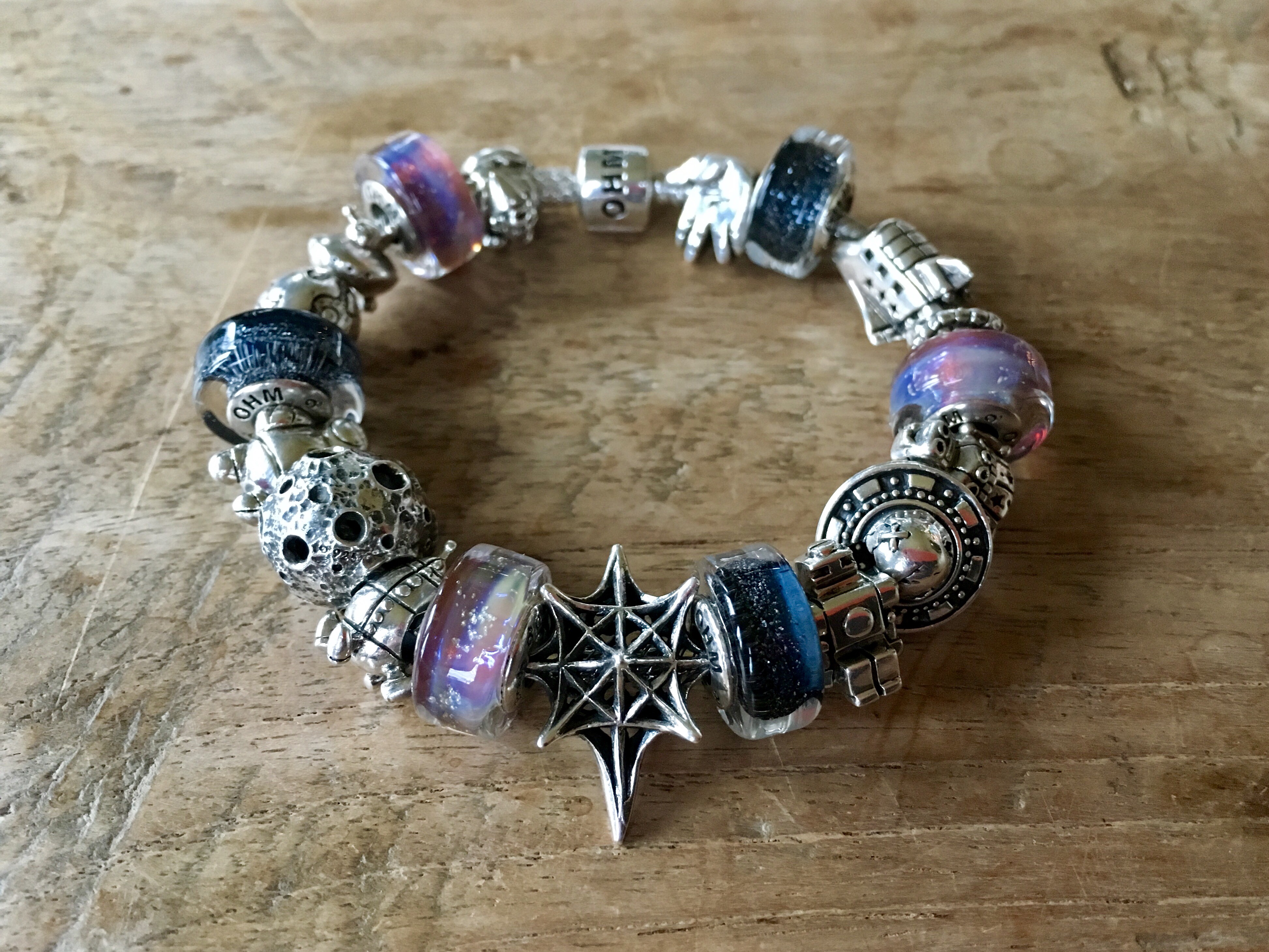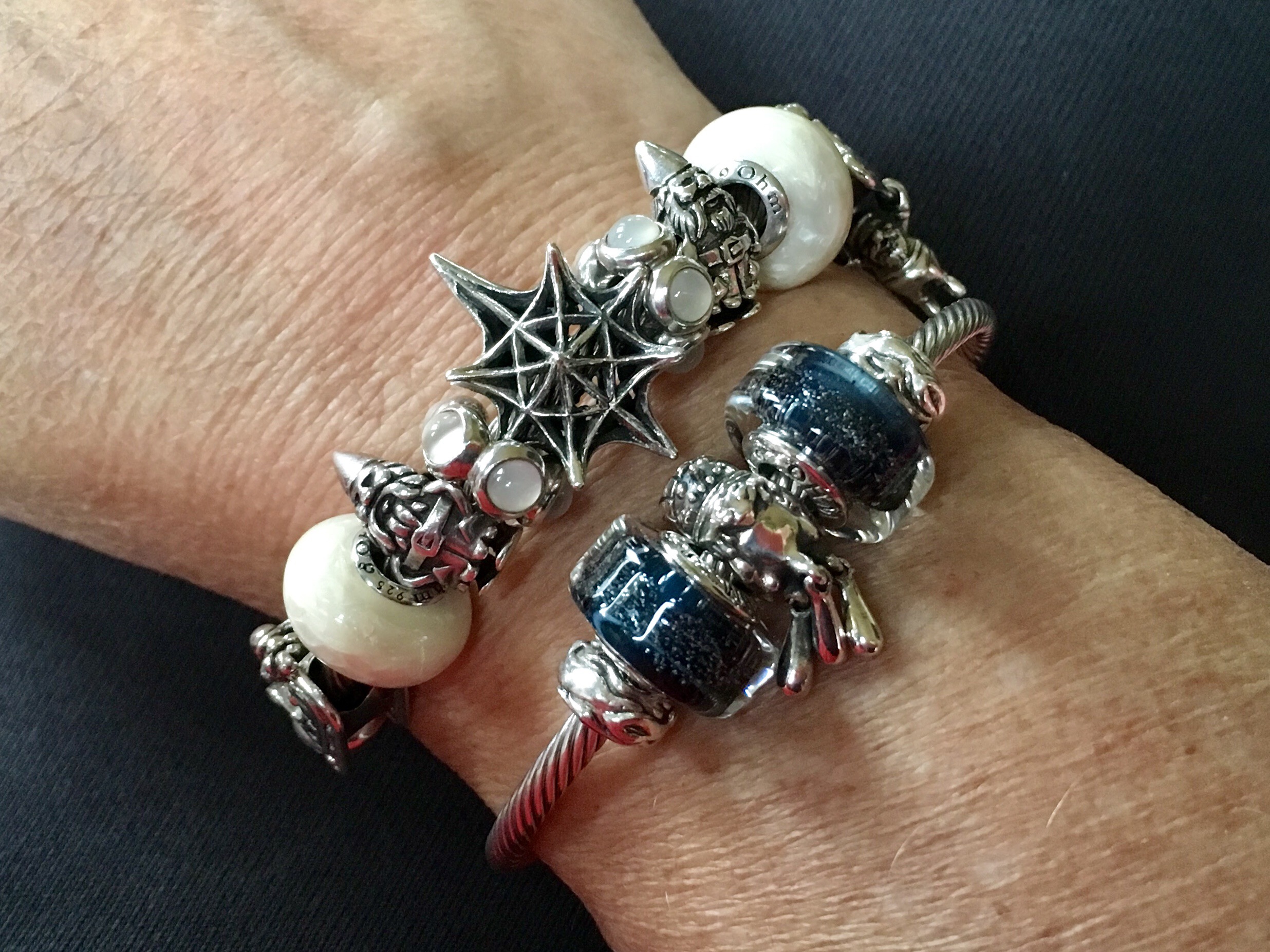 Stacked on a Pandora leather with a bangle called Go With The Snow. From left to right: Trollbeads Winter, Ohm beads Sugar Sleigh Ride 1.0 (LE 2014), Ohm beads Ice Lux, OhmGnome, Pandora Moonstone cabochon, Redbalifrog Tomte, Pandora Moonstone cabochon, OhmGnome, Ohm beads Ice lux, Ohm beads Sugar Sleigh Ride 2.0 (BOTM October 2016).