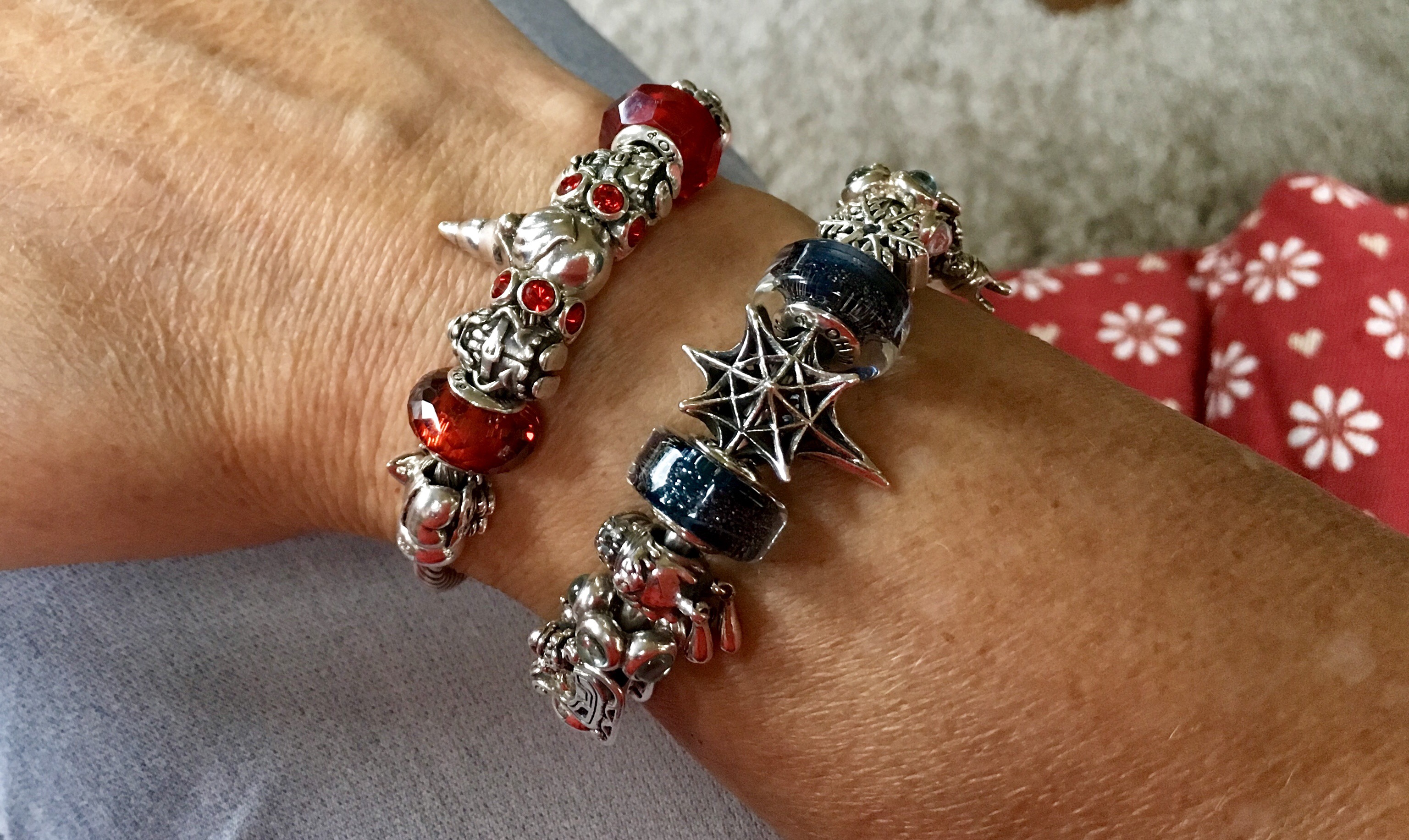 And stacked with the Gnomes Christmas Party bangle in festive red: there’s always that one joker at every Christmas party! Moon Me (Special Edition 2016), Ohm facet glass Passion Red and Living red and two June spinners.