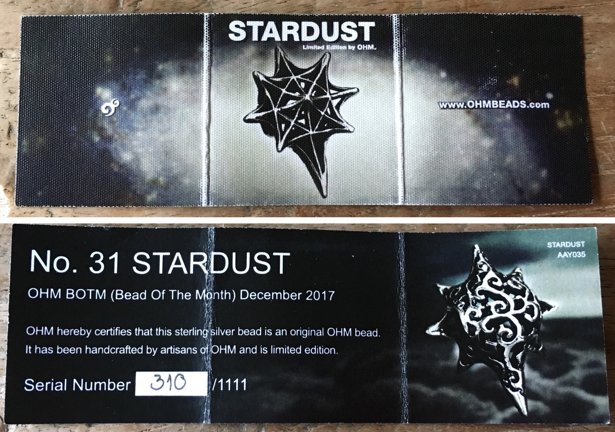 And a certificate saying this is limited to 1,111 beads. This is no. 310. This number is engraved in the bead.