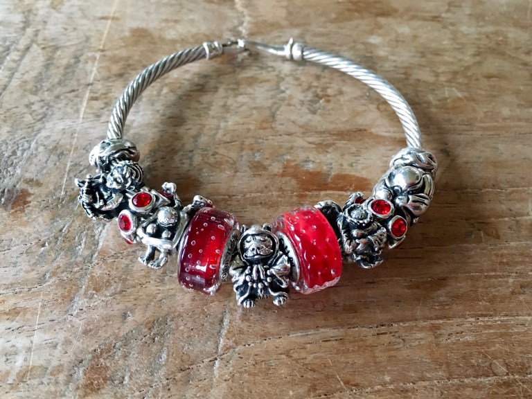 For my blogpost Time Flies I made a similar bangle with a rooster and a dog. Now that I have the right dog bead I can make the right bangle called Time Flies Year after Year, with Year of the Rooster (BOTM January 2017), Rainbowed, Time Flies, Strawberry (LE 2017) and YOTD.