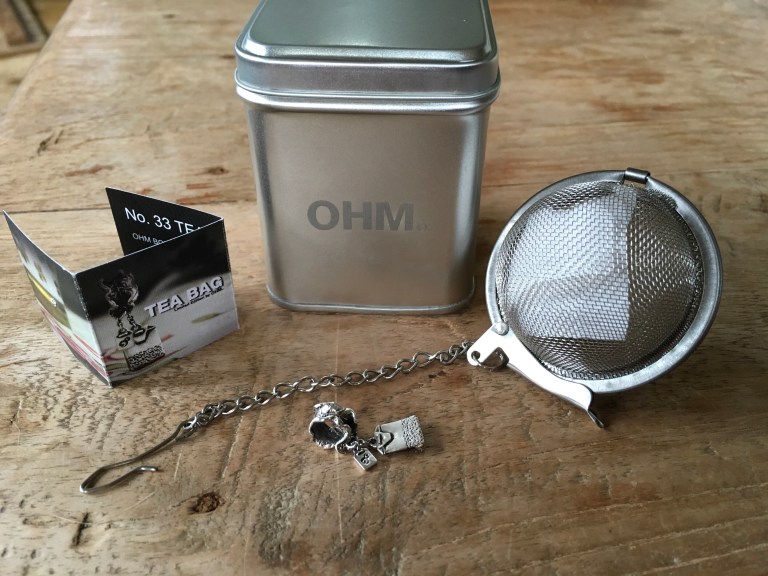It comes very appropriately packaged! Inside an Ohm tea tin there is a tea strainer. Both you can really use! Inside the tea strainer is the bead packaged in a teabag! You actually have to rip that open to get the bead out!