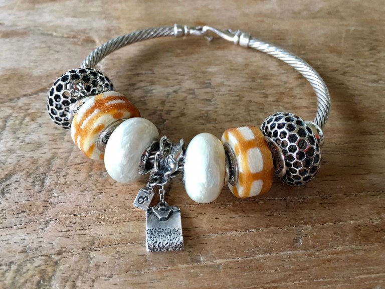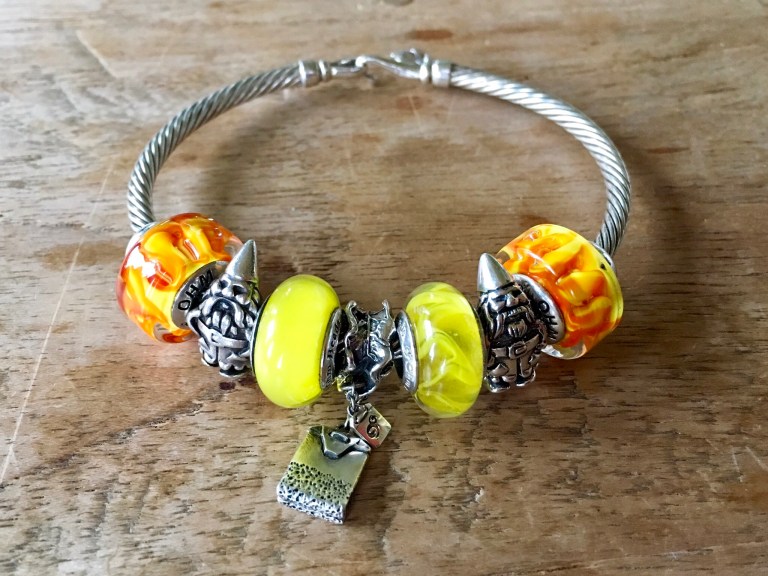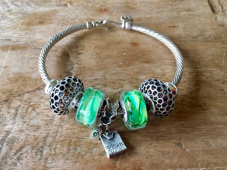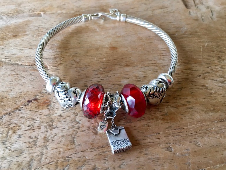 And talking about Britain and their tea, I always love how they grab a cuppa if things go bad! When a crisis is at hand, go and put the kettle on! So I call this bangle “Cup of tea love?” With two Love Hurts and two facet glass beads.
