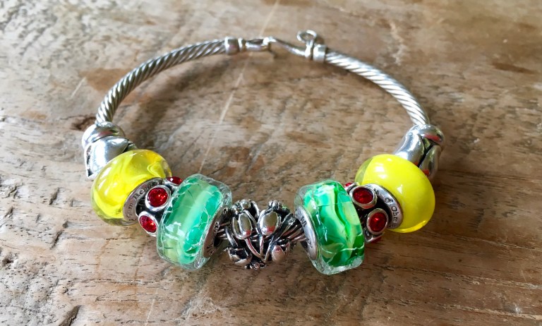 They are joined on this bangle with Ohm beads red faceted glass, Feel Bangin’ and Rooster.