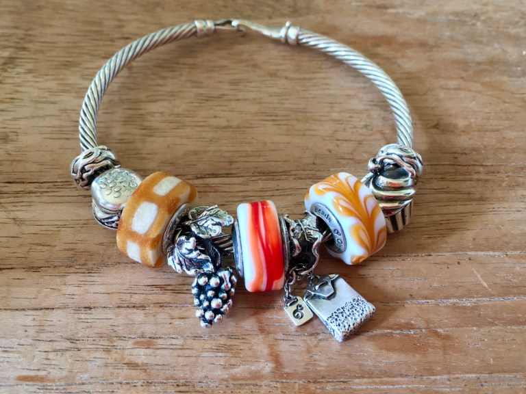 This bead is a very basic bead at first glance, but it gives the perfect autumnal feel to any bracelet! I will be using this one a lot during this fall season! Bangle with Butterflies, Libra, Poisoned Apple, Celebrate, We Learn As We Age and Beadmail.
