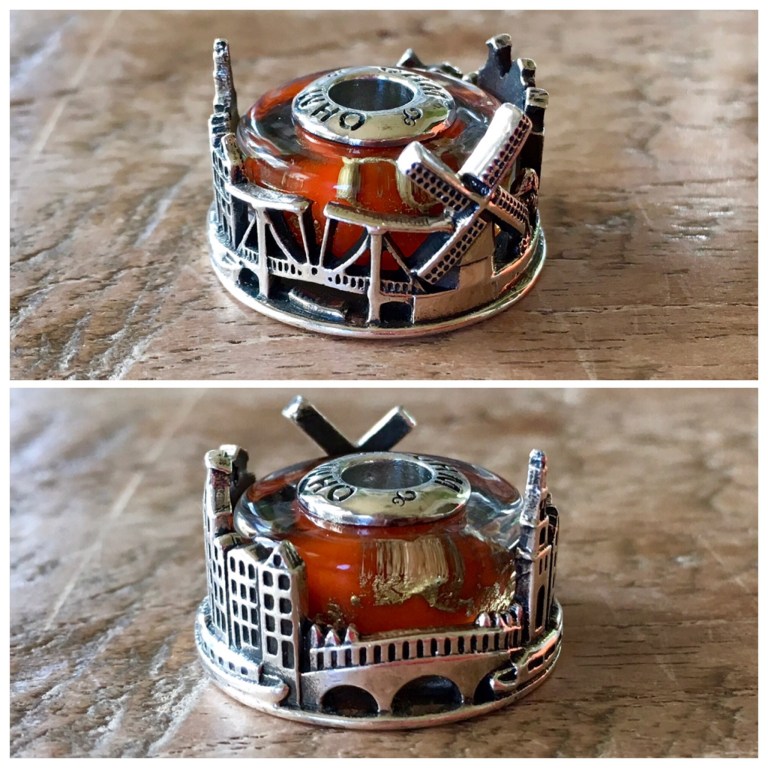 My complete Dutch bracelet with Trollbeads and Pandora glass, Trollbeads bracelet, Dutch Tulip and Amsterdam Townhouse, a cute lion and Redbalifrog Dutch Clogs.