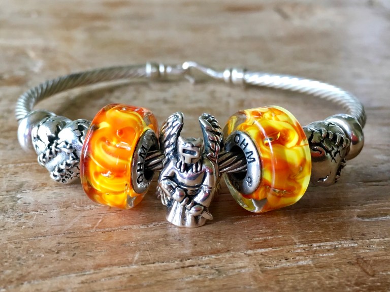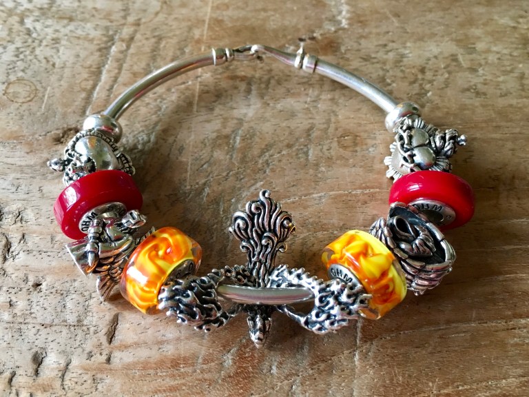 Archangel Mikael’s matching element is Fire! It helps enlightening people’s souls by awakening them to spiritual truth. So I made a small bangle with two Fireball and two Love Hurts.