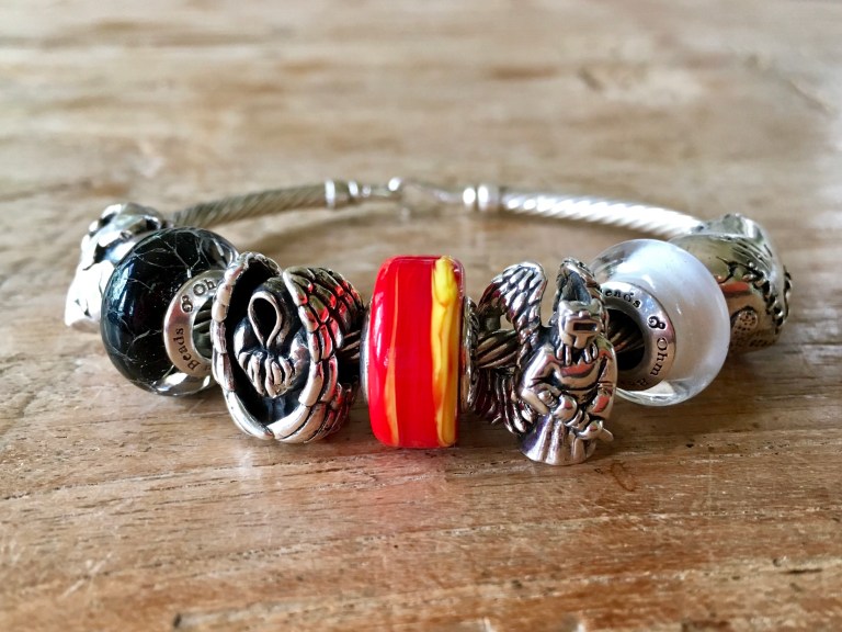 The Battle between Good and Evil. On a bangle with Heart of Stone, Dark Soul, OhmMyGod 4.0, Fire-ation, Archangel Mikael, Cold Milk 1e and Love Hurts 2.0.