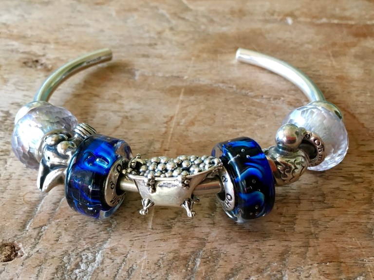 And when I finally get home I strip all my clothes off and take that long awaited soak! Trollbeads bangle with Ice, Trollbeads Venus of Willendorf, Waterfall, Soak, Waterfall, Pandora Duck and Ice. And look…