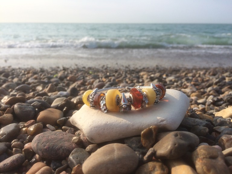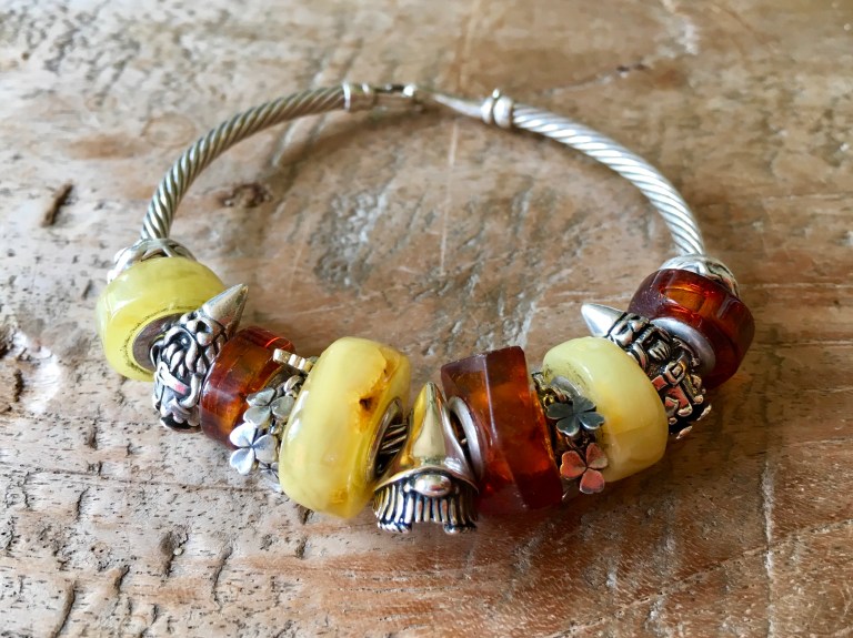 It happens I am bananas about Scandinavia and we have been traveling to Denmark for years now! So Tomte could return to his country of origin with me! For our summer holiday I made a bangle with amber beads I bought on previous Denmark trips. With two OHM Gnomes, Lucky Moves and Moving On. Stacked with my OHM bracelet with glass colours inspired by amber!