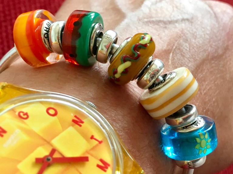 I love the yummy detail on Watermelom and I feel it looks so delicious solo on a bangle stacked with more colourfull beads and bracelets for a summer festival feel! Bracelet with the new summer Slim glass beads Koi (orange), Sun (yellow) and Lawn (green) and Heart of Stone, Yingle Locks, Rainbowed, Woodstock Love and Mended Heart.