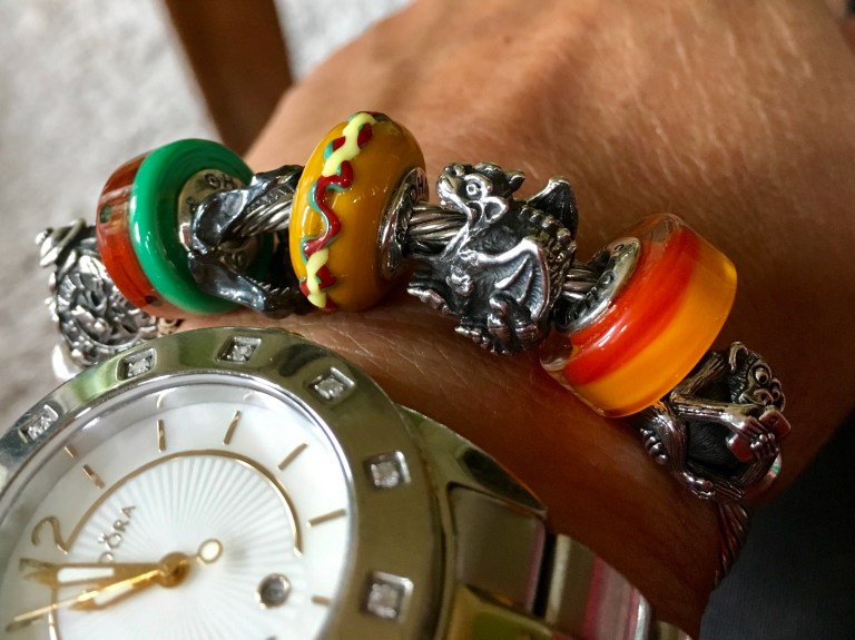 I made a cute bangle with three of the glass beads: “Monkey will time you, who eats Cheeseburger the fastest? 3-2-1GO!” With We Learn As We Age, Watermelon, Baby Megalodon, Cheeseburger, Gargoyle, Cheesy and Monkeybusiness.