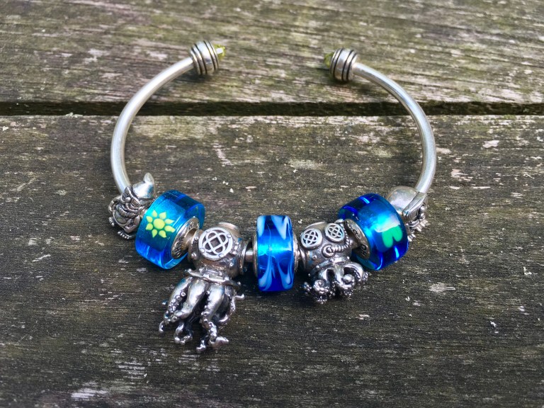 All the coffee themed Bead of the Month July together on a bangle! It started with Latte on the left (2015), then Caramel Latte, a set of two sugary textured glass beads (2016), Coffee Collection, a silver set of coffee to go and a coffee to stay (2017) and Black Coffee (2018).