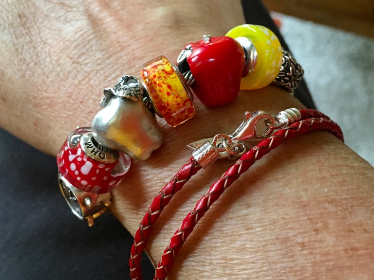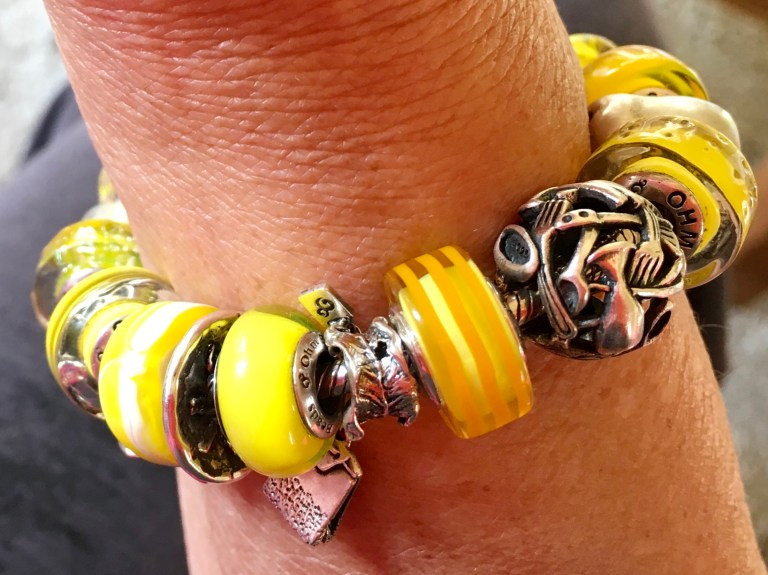 And this is a sensory overload! A full acid yellow sunshine bracelet with comfort food beads like pizza, veggie burger, chocolate and cupcakes! And an apple? Making an apple pie later! This will get me through the dark and dreary days!