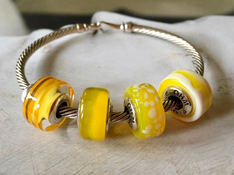 Put the four Lemons together and they are a colour explosion on your wrist! Here a bangle with two July Spinners and Forbidden Fruit.
