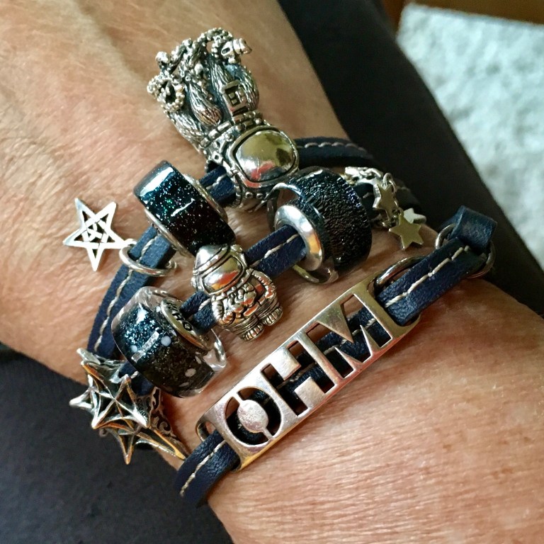 The Navy coloured Whip leather bracelet is perfect for starry night combinations! Astronargh and Gnomestronaut are floating through space! With Stardust, Woodstock Star and Lucky Stars. And OHM WHO clasp.