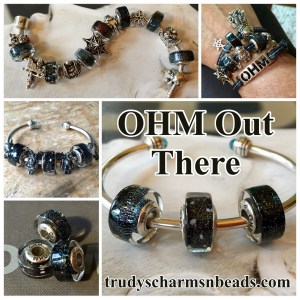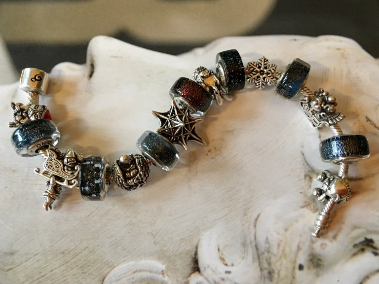The Out There collection is so perfect for a winter/Christmas themed bracelet! On this bracelet the glass beads are from left to right: Night Sky, A Sirus Wish, Night Sky, Sunset, Galaxy, Night Sky and Deep Blue. And with Ho! Ho! No, Sugar Sleigh Ride 2.0, OHM My God 3.0, Stardust, You Melt Me, Snowflake, Sugar Sleigh Ride and Hug Me.