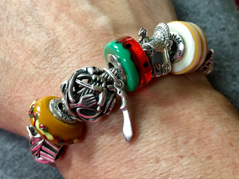 Part of the Thanksgiving feast is having a great dinner! One of the beads OHM made for an ealier Thanksgiving is The Feast. A bangle with Cupcake, Cheeseburger, The Feast, Body Slicer, Watermelon, At Least I’m Warm, Frappe and Chocolate Bar.