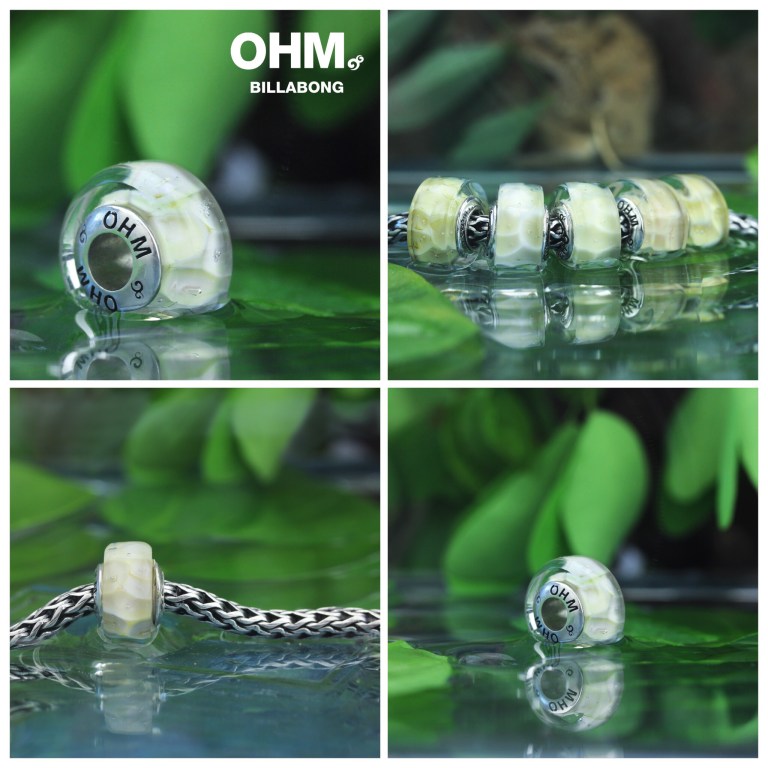 Ohm is delighted to celebrate the Australian Billabong with this rippling and beautiful glass bead. The water is dappled with sunlight, and sparkles with crystal accents, as a welcome breeze stirs gentle rings across the surface. You can almost see the wild animals and thirsty humans gathering to partake in its cool refreshment. This bead will refresh your bracelet too with a soft and subtle color. Let it remind you that the flow of life may change its course, but though one resource may be diverted, another opportunity will always open, perhaps more important than before.