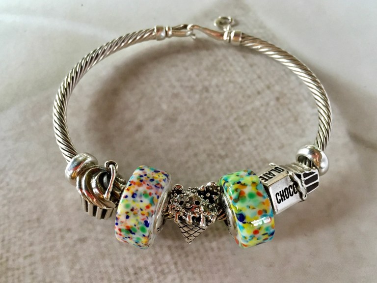 Ice cream is the ultimate candy for me! So I made a bangle with two spotted glass beads that are like the sprinkles on top! With Cupcake, Birthday Cake, Sweectus, Cofetti Upchuck and Chocolate Bar.