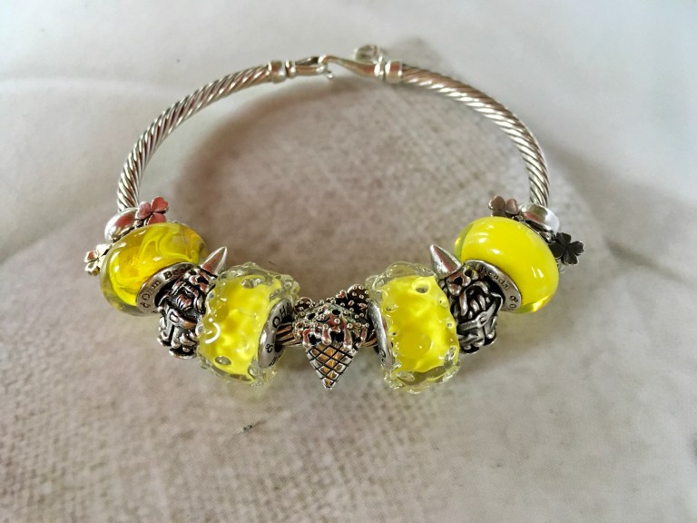 Oh, how I long for summer! And so do the OHM Gnomes! A bangle with Lucky Moves, Sunshine, OHM Gnome, Full Plexus, Sweectus, Full Plexus, OHM Gnome, Forsythia and Moving On.