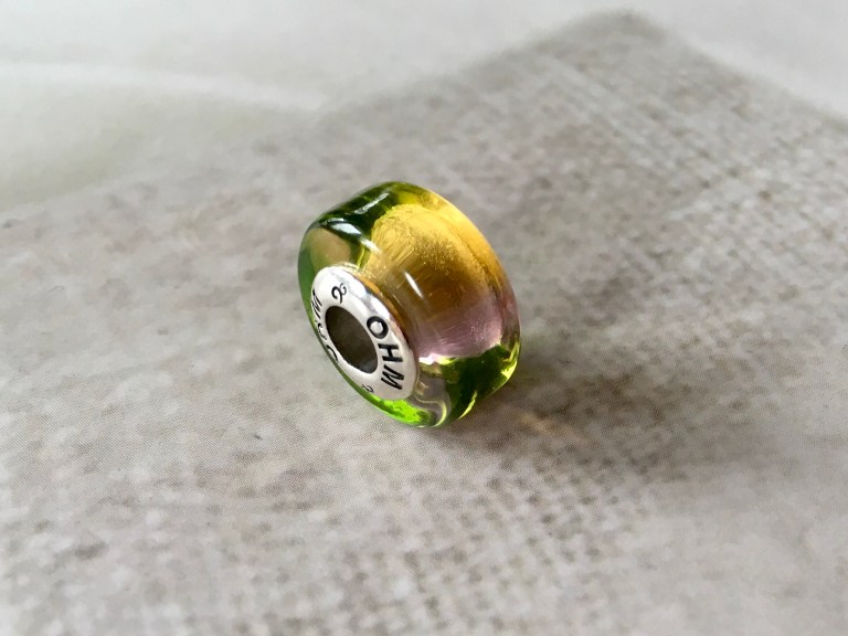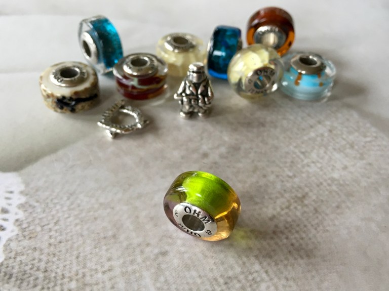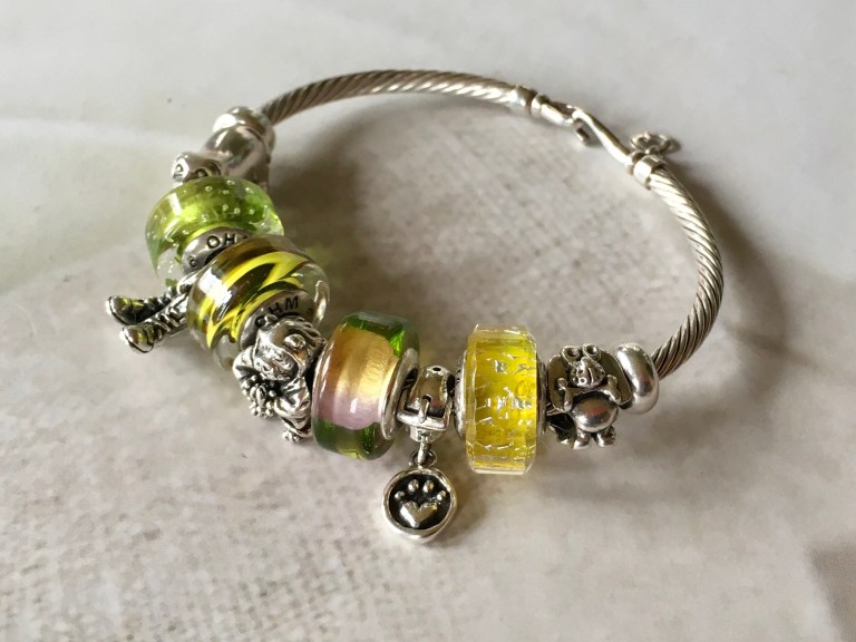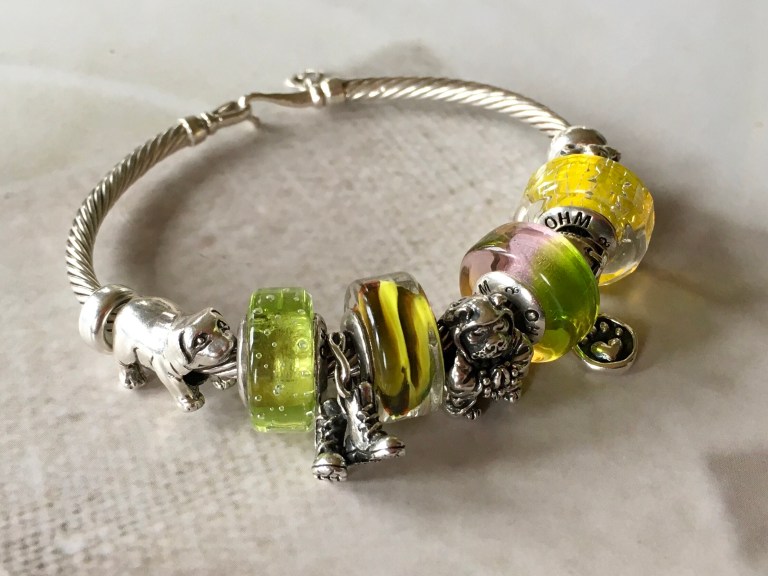 Here I combined Gouldian with some other sunny yellow and lush green glass on my doggie bangle. With Labrador Retriever, OHMnique, Non Violence, OHMnique, Year of the Dog, Gouldian, SHS Animal Rescue, Yellow Sunlight and Dog & Bone.