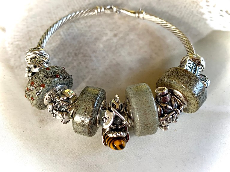 The bangle I made has ofcourse more honey and bee related beads. OHM made a cute Bee collection in the past. Here are Buttercup, two Hipster Hops, Thank You, two Hive Mind, Big Fat Killer Bee, Expand, Grow and Live Free.