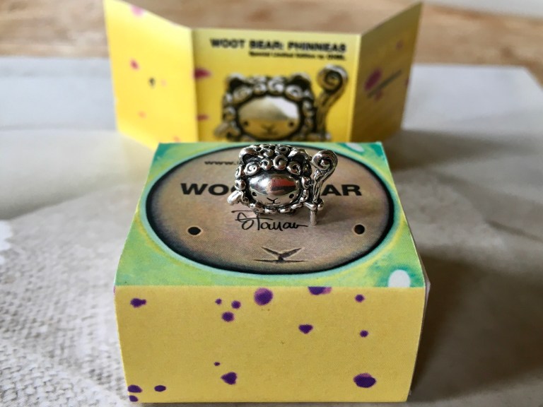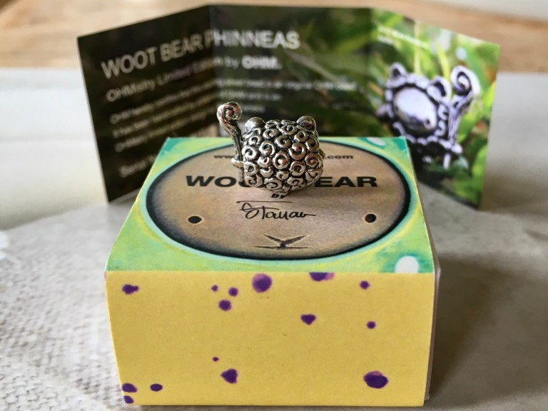 The Woot Bear design was born in Steve Ferrera’s Berkeley art studio in 2016 for an art show at Woot Bear Gallery in San Francisco. The original bear was a 5-inch tall solid cast resin figure painted with acrylic paints. For the show, a dozen top toy designers were asked to customize the bear. The design continues to evolve and find new iterations, this time finding a home in the jewelry and bead world with OHM. The bead designs were created by OHM who incorporated some signature swirls found in their logo.