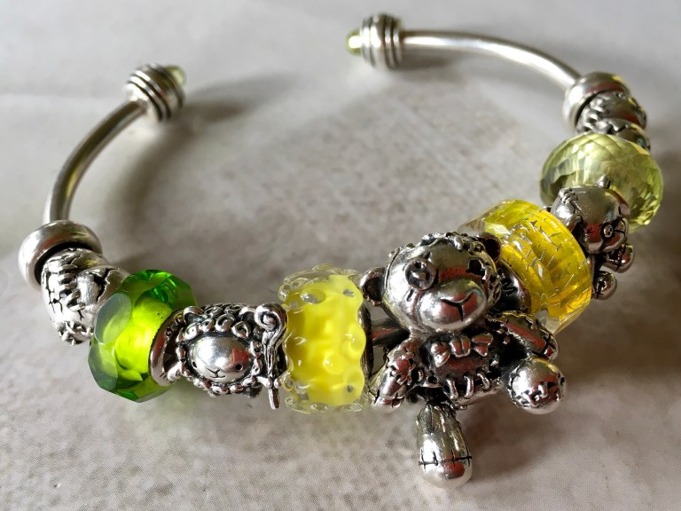 Joining Woot Bear Phinneas are two more OHM bears Hug Me and Hug Me 2.0 and two Love Hurts! I took the yellow/green colour combination from the sweet package. The glass are two green facets and Full Plexus Yellow Sunlight.