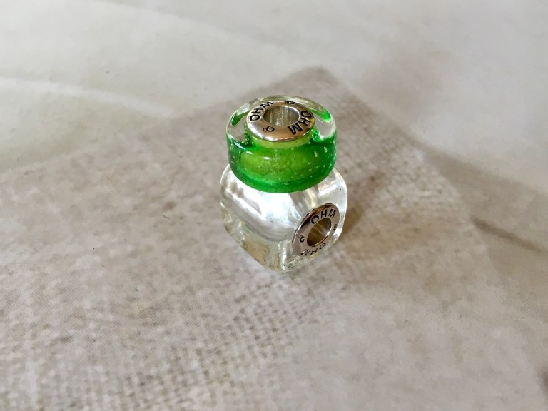 Green is a beautiful colour and I took out all the ones I have! This bracelet is about my childhood memories. On Saturday playing all day and going into the bathtub at the end of the day! On here are more glass beads from the April release. The glass are from left to right facet, Green Crack, Lime, Mojito, Foliage, Slim Mow, Pandan Jelly, Dustberry and facet.