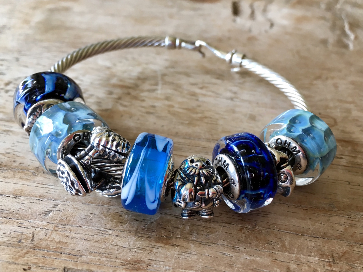 I have already shown you some combinations I made with the Alice collection beads on social media, but here they are again! This bangle is my Bloggers Bangle! I am a blogger, I write about the magic world of beads, bangles, bracelets and beadmail! So here are Meeting Notes (something to write on), Gallymoggers, Quill (something to write with), White Rabbit, Magic Sight (something to see beads with), Saganistute and Beadmail (something to send beads in)! This bangle was actually inspired by Harry Potter’s Rita Skeeter!