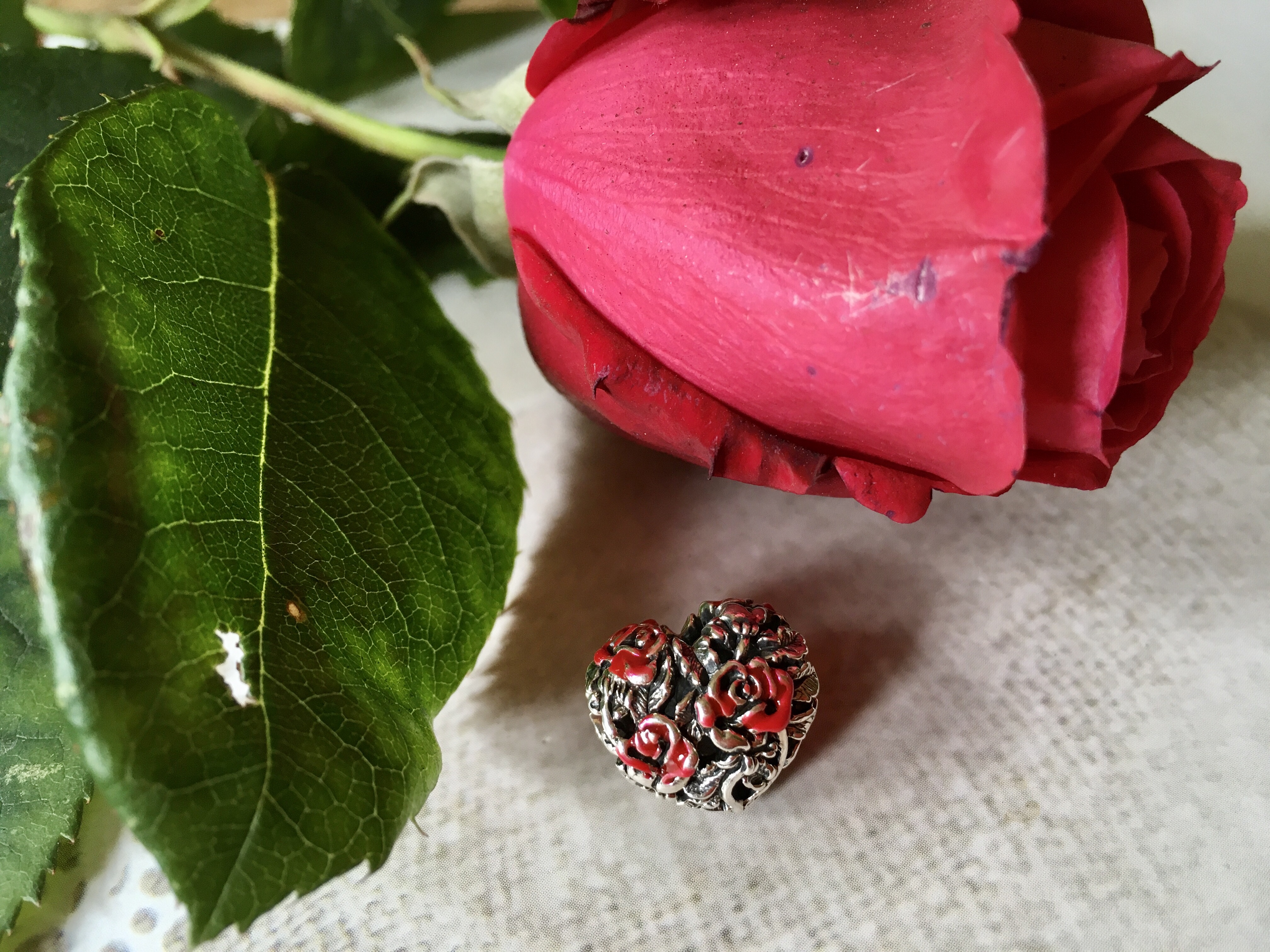 Painting The Roses Red is such a surpising design, a silver heart with the roses lightly dusted over with a touch of red enamel. A gorgeous detail to highlight the delecate flowers and gives the bead so much depth and interest!