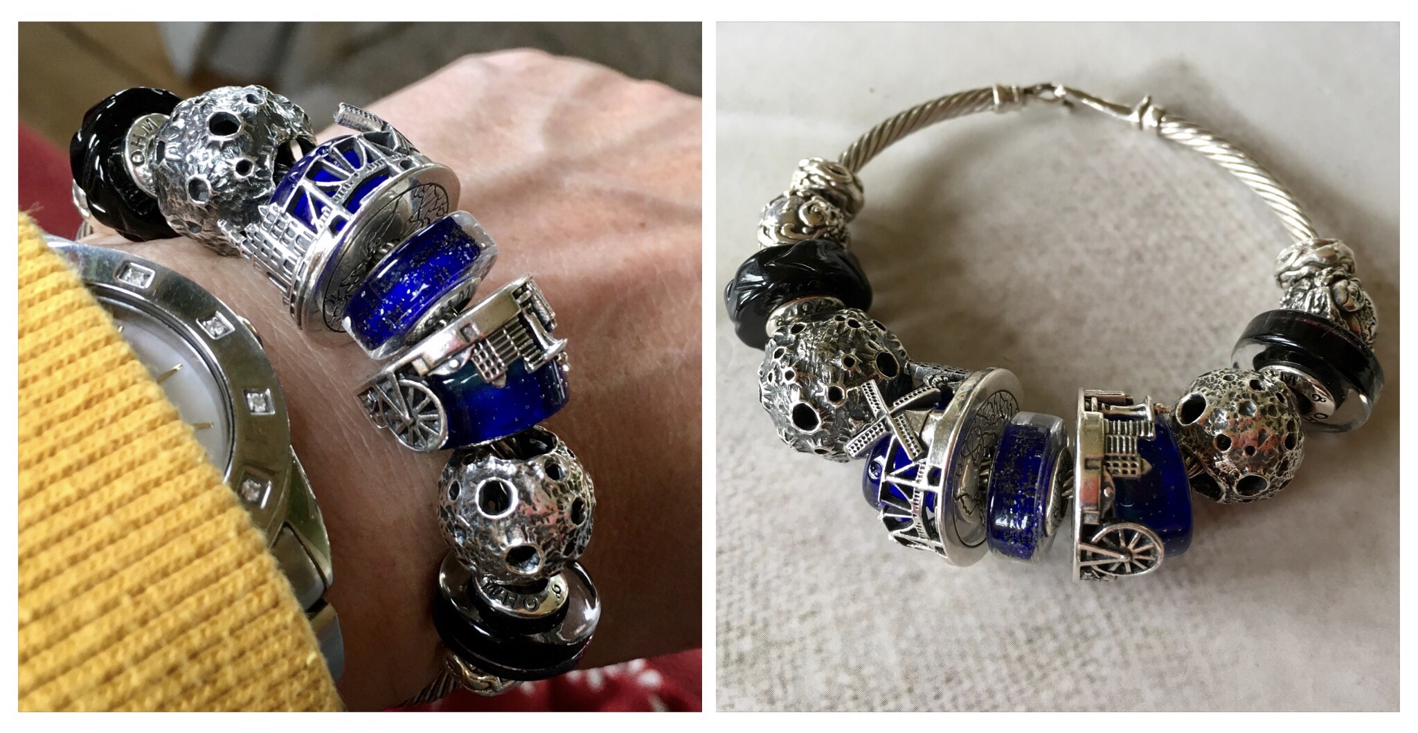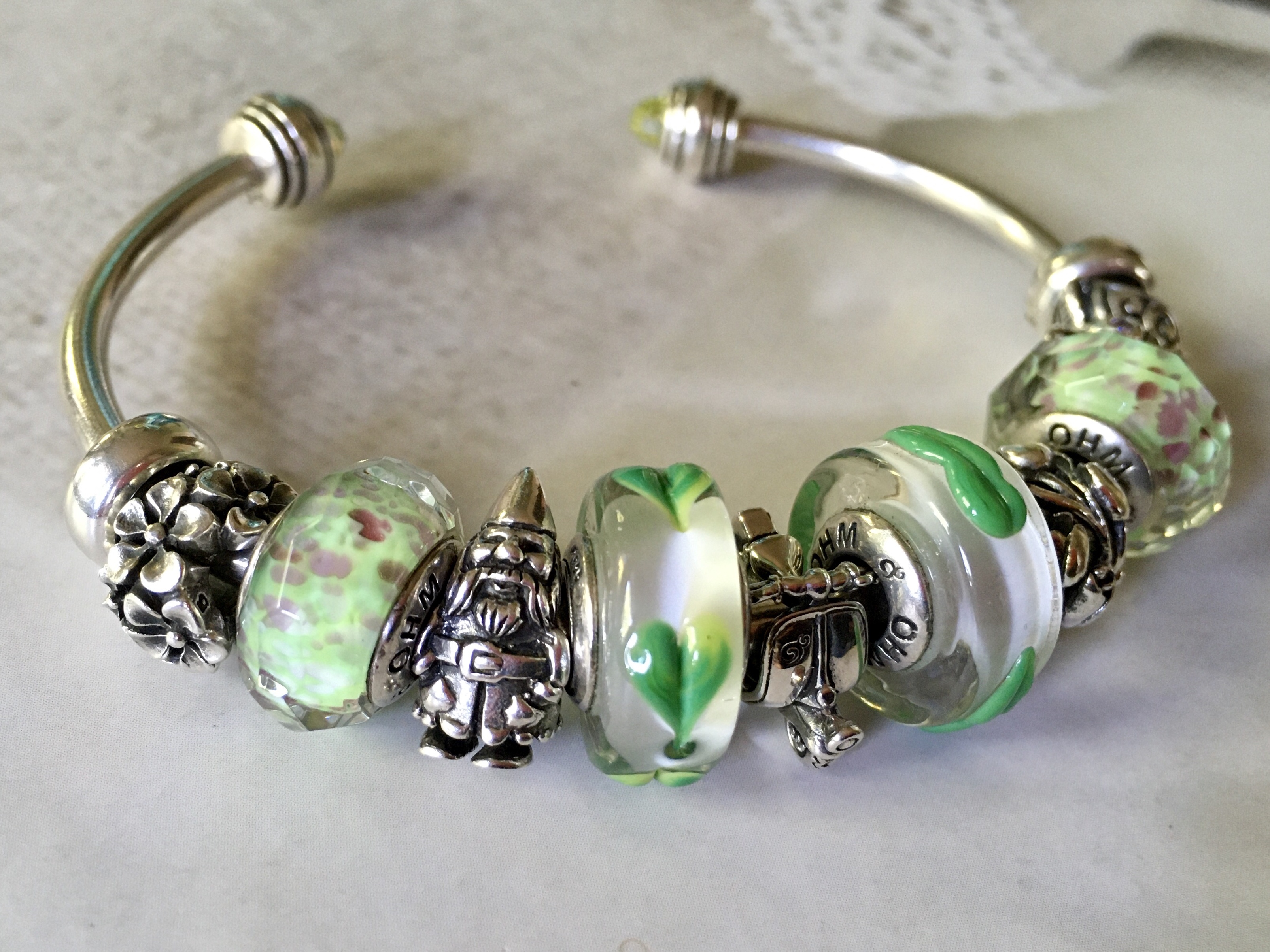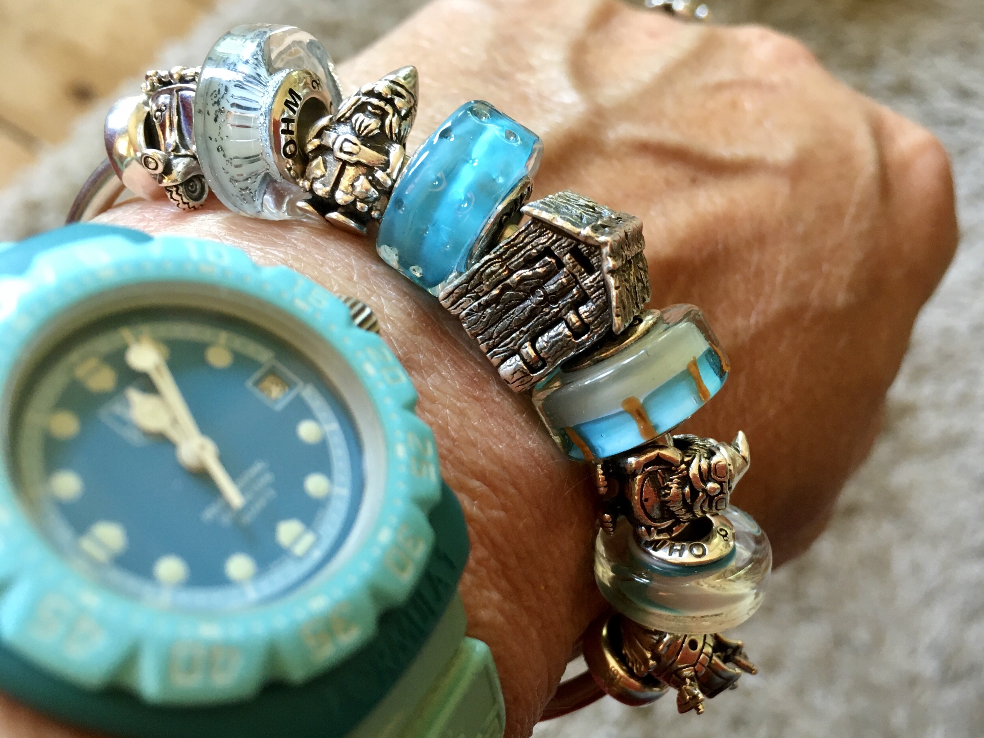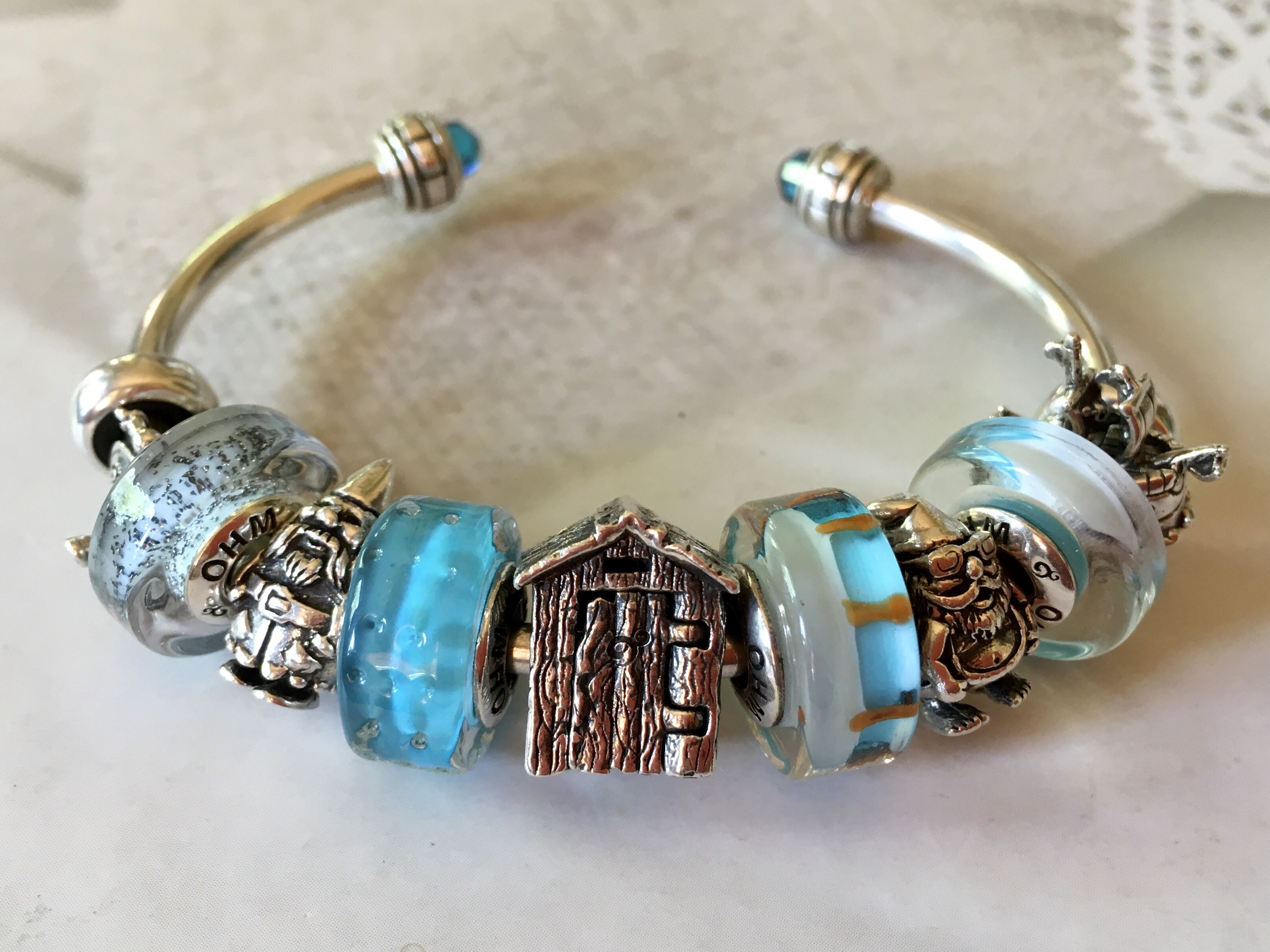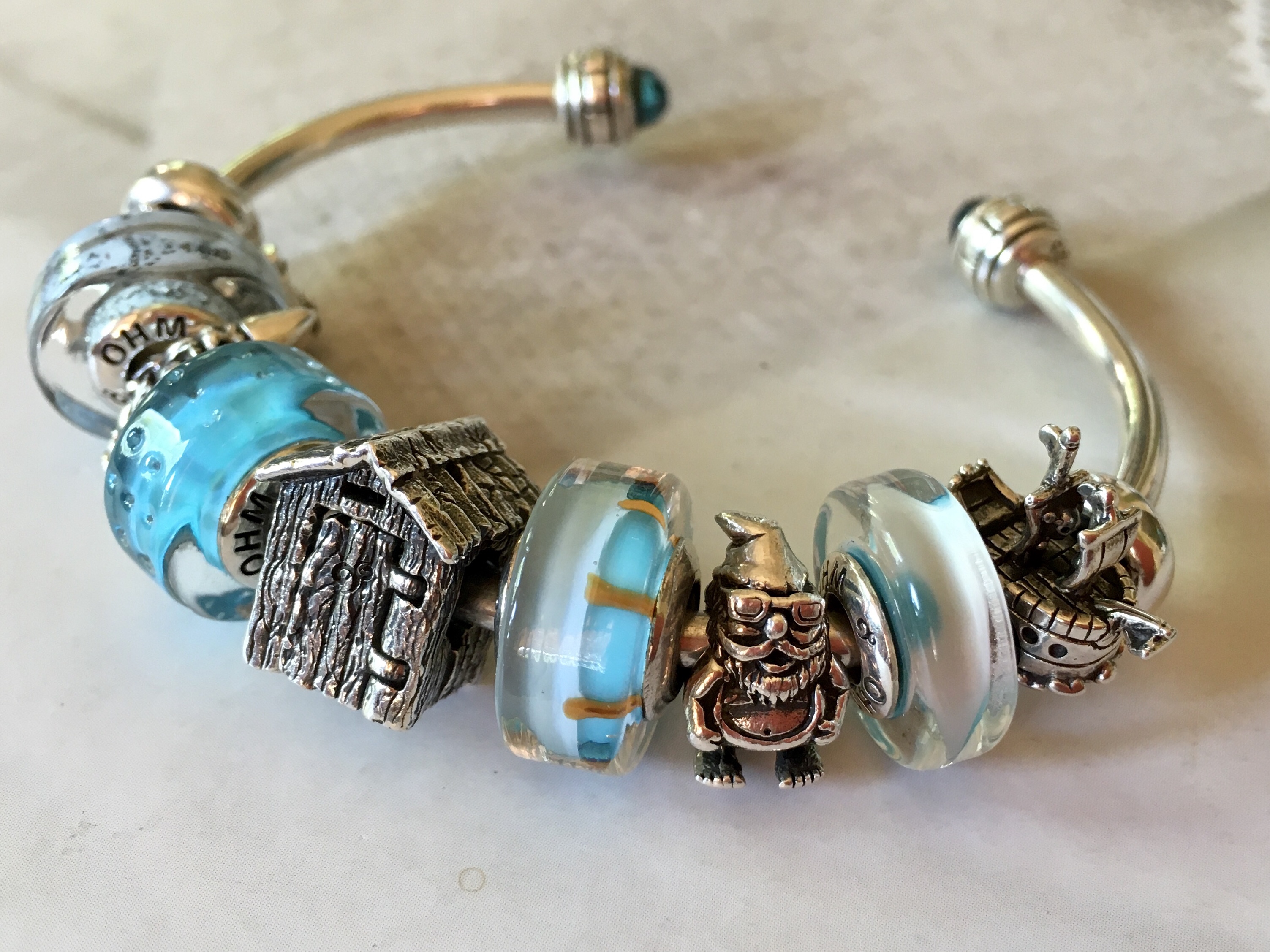 OHM Gnome rode to the beach to meet up with Mankini at his beach hut! The last Slim glass bead Turn is a lovely clear glass light blue bead with black dots and silver sparkles. C bangle with Ride Along, Turn, OHM Gnome, Blue Faspberry, The Office, The Twelve Apostles, Mankini, Wisp and Pirate Ship.