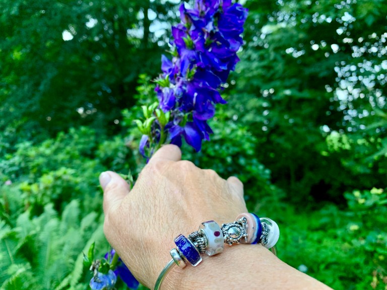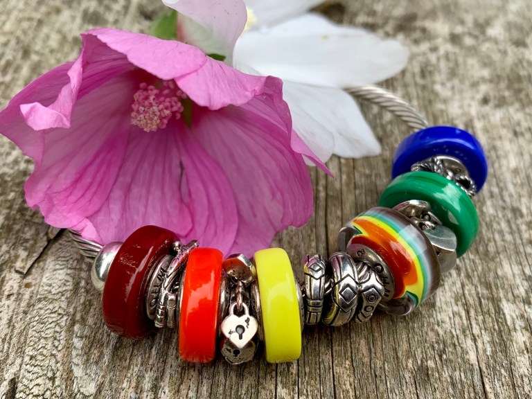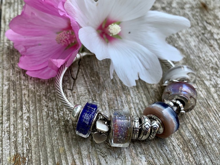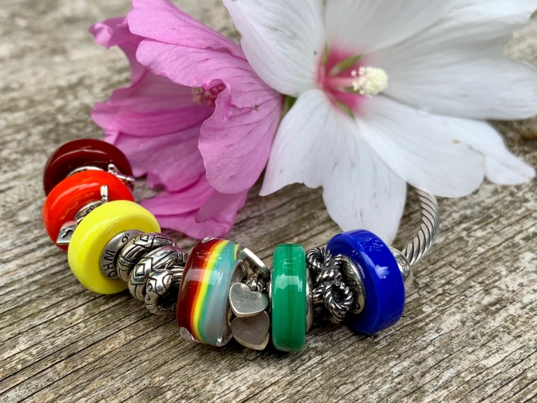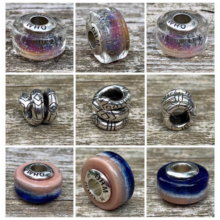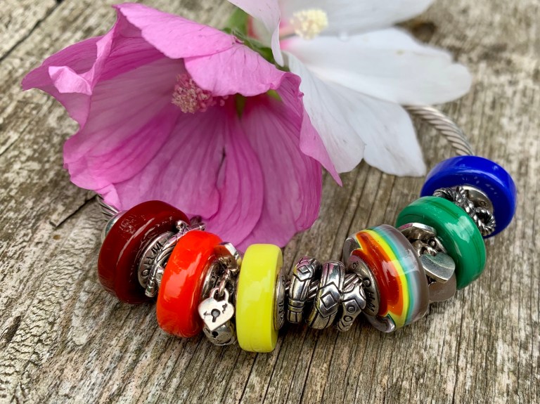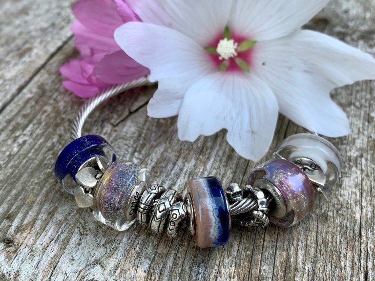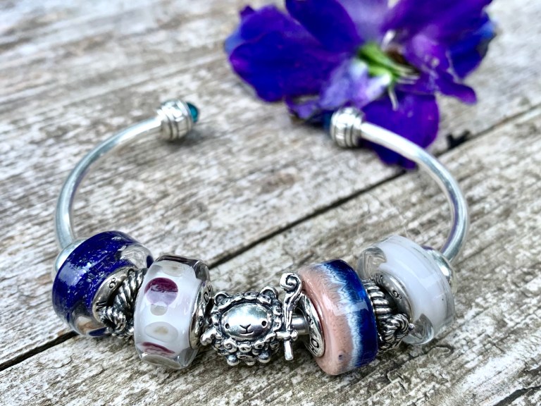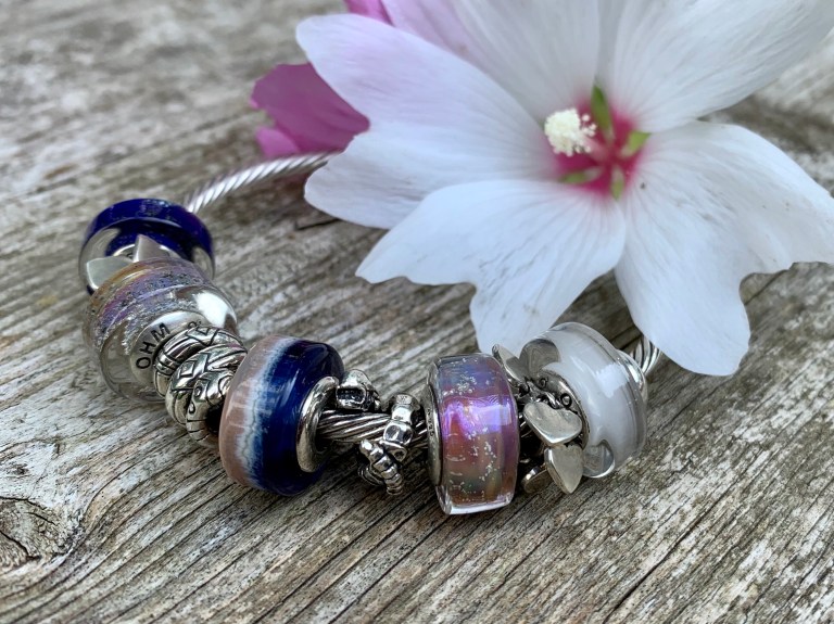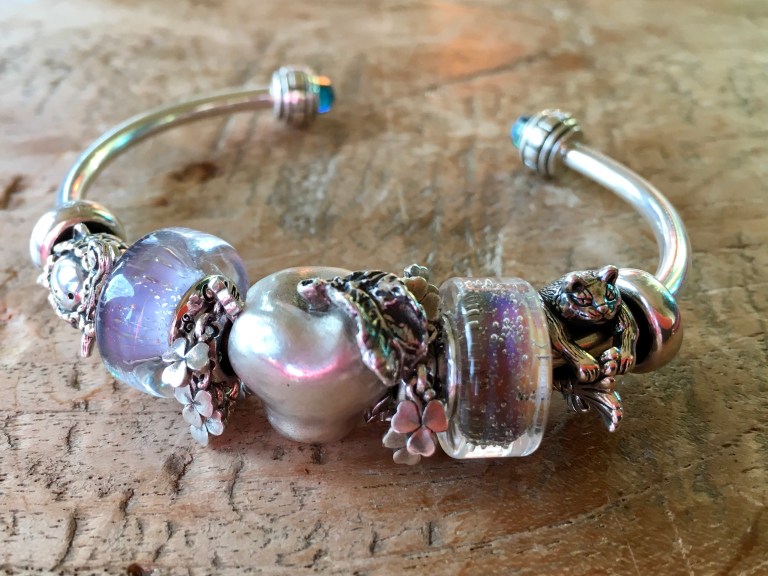 Fairy Wren combined beautifully with other pinks and earthy colours! Saganistute from the Alice collection and the Slim glass beads Haze and Plant are perfect! Candy Crush, Sweet Treat and Sugar Dipped are the three square glass beads from the Dessert collection. On the C Bangle with Woot Bear Phinneas, Apple, Catfish, Lucky Moves and Moving On.